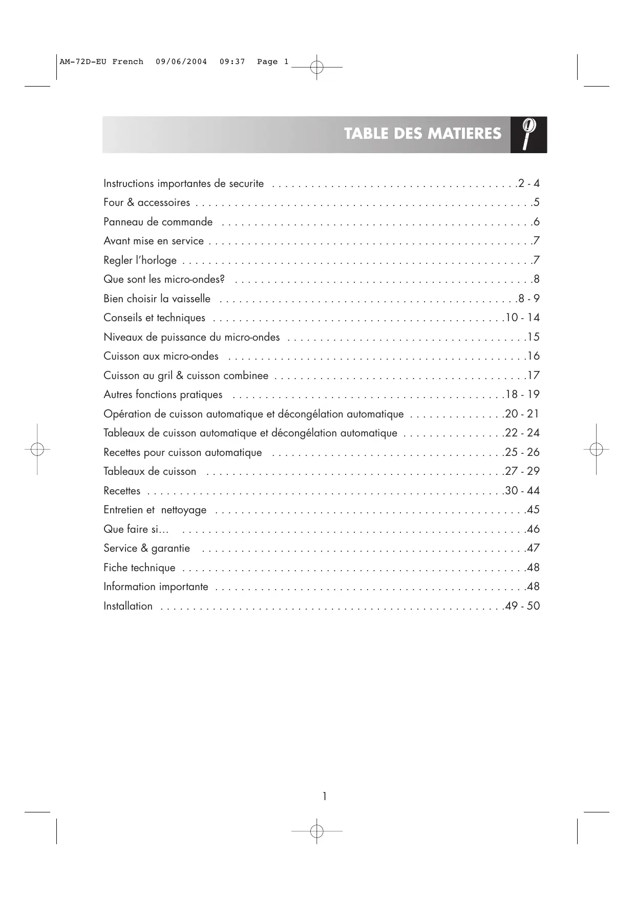Four à micro-ondes avec Gril simultané AM-72D-EU French 09/06/2004 09:37 Page B AM-72D-EU French 09/06/2004 09:37 Page 1