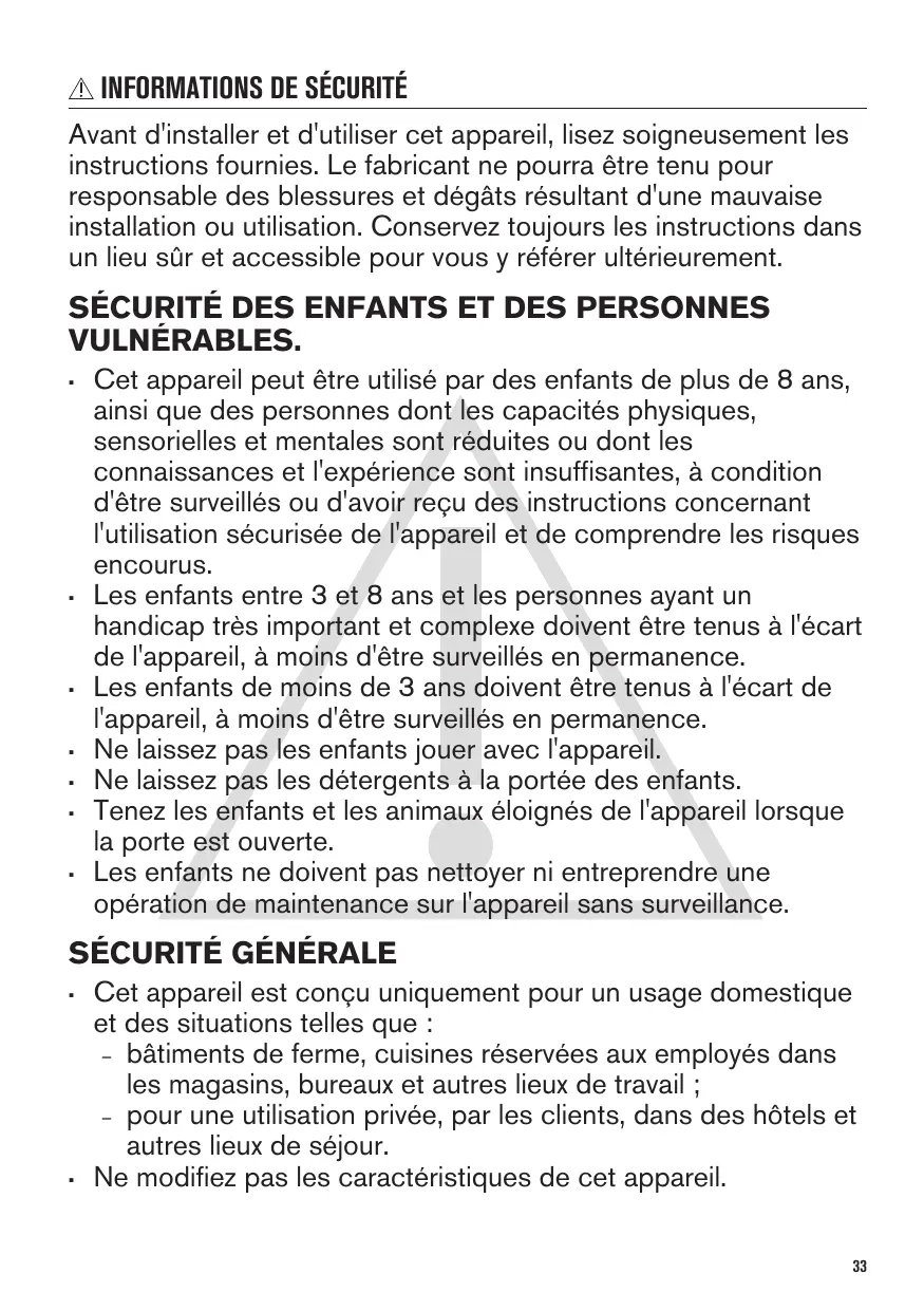 Cet appareil peut être utilisé par des enfants de plus de 8 ans, ainsi que des personnes dont les capacités physiques, sensorielles et mentales sont réduites ou dont les connaissances et l'expérience sont insuffisantes, à condition d'être surveillés ou d'avoir reçu des instructions concernant l'utilisation sécurisée de l'appareil et de comprendre les risques encourus. Les enfants entre 3 et 8 ans et les personnes ayant un handicap très important et complexe doivent être tenus à l'écart de l'appareil, à moins d'être surveillés en permanence. Les enfants de moins de 3 ans doivent être tenus à l'écart de l'appareil, à moins d'être surveillés en permanence. Ne laissez pas les enfants jouer avec l'appareil. Ne laissez pas les détergents à la portée des enfants. Tenez les enfants et les animaux éloignés de l'appareil lorsque la porte est ouverte. Les enfants ne doivent pas nettoyer ni entreprendre une opération de maintenance sur l'appareil sans surveillance.