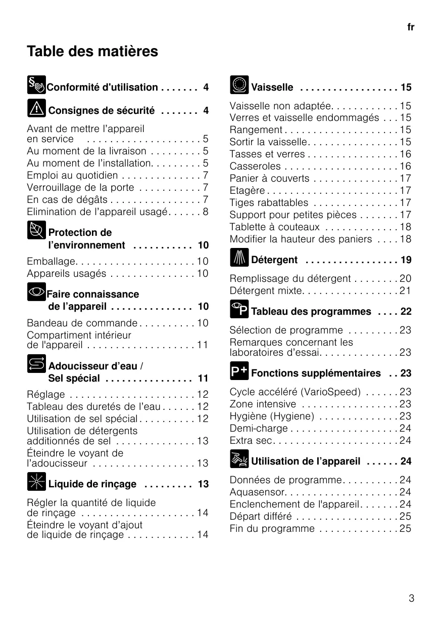 Vaisselle non adaptée. . . . . . . . . Verres et vaisselle endommagés Rangement . . . . . . . . . . . . . . . . . Sortir la vaisselle. . . . . . . . . . . . . Tasses et verres . . . . . . . . . . . . . Casseroles . . . . . . . . . . . . . . . . . Panier à couverts . . . . . . . . . . . . Etagère . . . . . . . . . . . . . . . . . . . . Tiges rabattables . . . . . . . . . . . . Support pour petites pièces . . . . Tablette à couteaux . . . . . . . . . . Modifier la hauteur des paniers . . Détergent