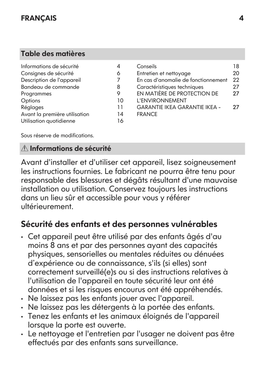 Description de l'appareil Bandeau de commande Programmes Options Réglages Avant la première utilisation EN MATIÈRE DE PROTECTION DE L'ENVIRONNEMENT GARANTIE IKEA GARANTIE IKEA FRANCE