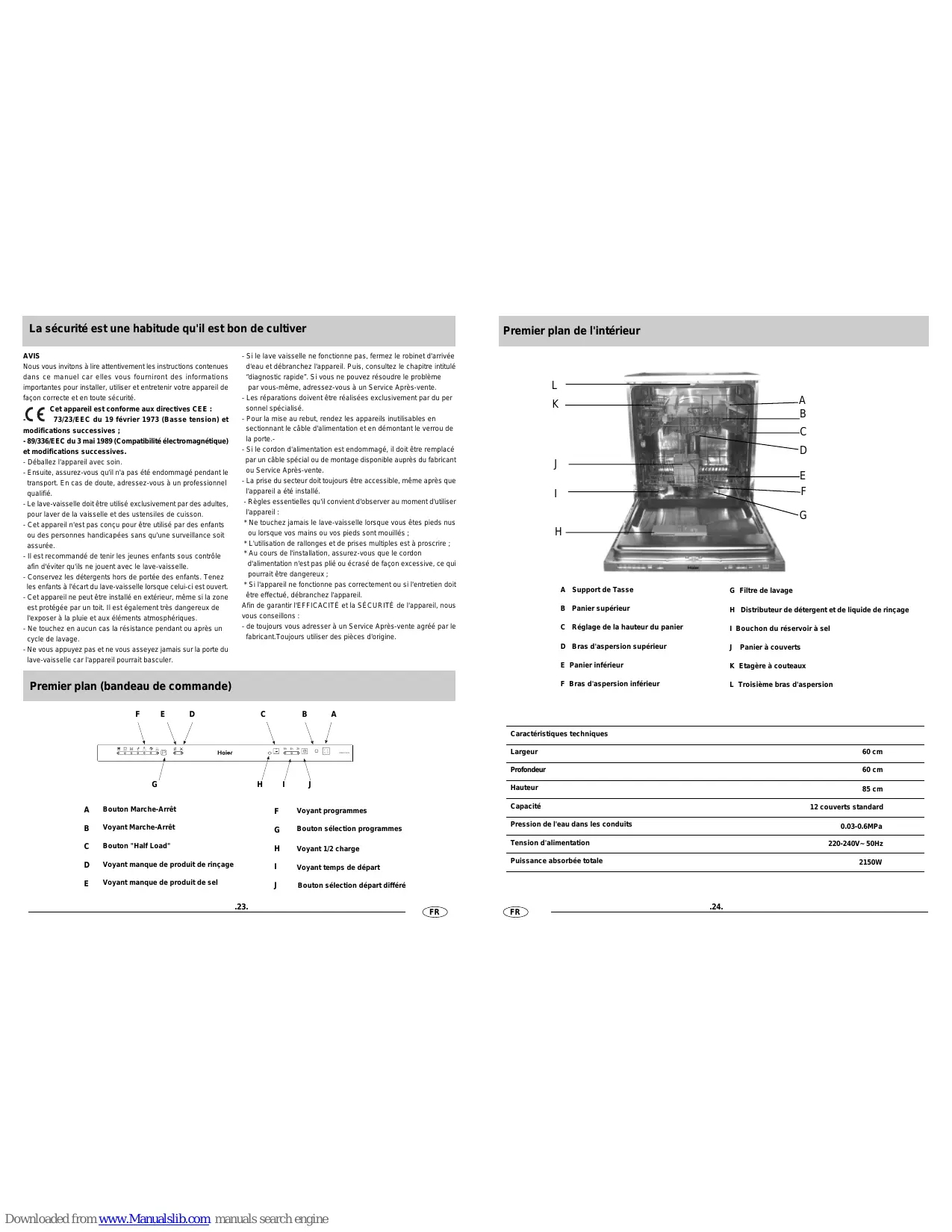 La sécurité est une habitude qu'il est bon de cultiver AVIS Nous vous invitons à lire attentivement les instructions contenues dans ce manuel car elles vous fourniront des informations importantes pour installer, utiliser et entretenir votre appareil de façon correcte et en toute sécurité. Cet appareil est conforme aux directives CEE : 73/23/EEC du 19 février 1973 (Basse tension) et modifications successives ; - 89/336/EEC du 3 mai 1989 (Compatibilité électromagnétique) et modifications successives. - Déballez l'appareil avec soin. - Ensuite, assurez-vous qu'il n'a pas été endommagé pendant le transport. En cas de doute, adressez-vous à un professionnel qualifié. - Le lave-vaisselle doit être utilisé exclusivement par des adultes, pour laver de la vaisselle et des ustensiles de cuisson. - Cet appareil n'est pas conçu pour être utilisé par des enfants ou des personnes handicapées sans qu'une surveillance soit assurée. - Il est recommandé de tenir les jeunes enfants sous contrôle afin d'éviter qu'ils ne jouent avec le lave-vaisselle. - Conservez les détergents hors de portée des enfants. Tenez les enfants à l'écart du lave-vaisselle lorsque celui-ci est ouvert. - Cet appareil ne peut être installé en extérieur, même si la zone est protégée par un toit. Il est également très dangereux de l'exposer à la pluie et aux éléments atmosphériques. - Ne touchez en aucun cas la résistance pendant ou après un cycle de lavage. - Ne vous appuyez pas et ne vous asseyez jamais sur la porte du lave-vaisselle car l'appareil pourrait basculer.