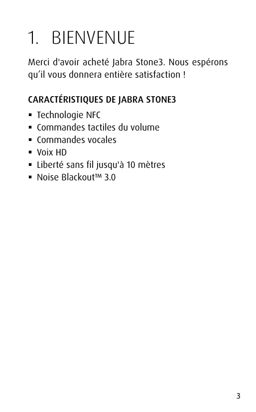 Merci d'avoir acheté Jabra Stone3. Nous espérons qu’il vous donnera entière satisfaction ! Caractéristiques de Jabra STONE3 Technologie NFC Commandes tactiles du volume Commandes vocales Voix HD Liberté sans fil jusqu'à 10 mètres Noise Blackout™ 3.0