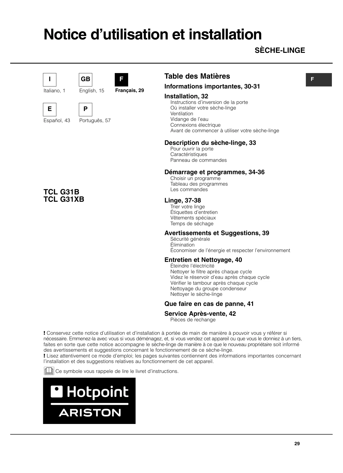 MODE D'EMPLOI FTCD87B6K - FTCF97B6HY HOTPOINT-ARISTON