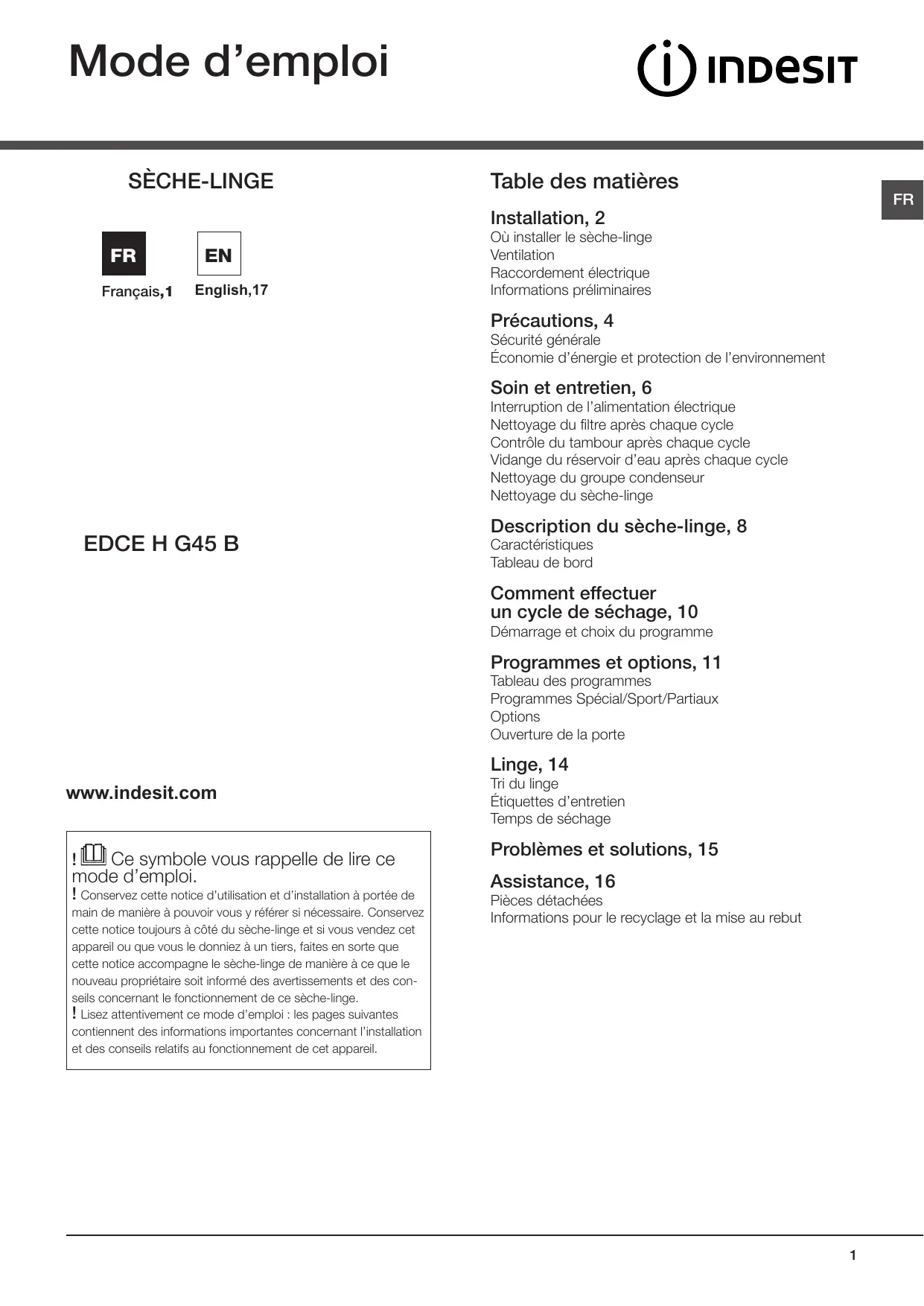 EDCEH G45 B - Sèche-linge INDESIT - Notice d'utilisation et mode d'emploi gratuit