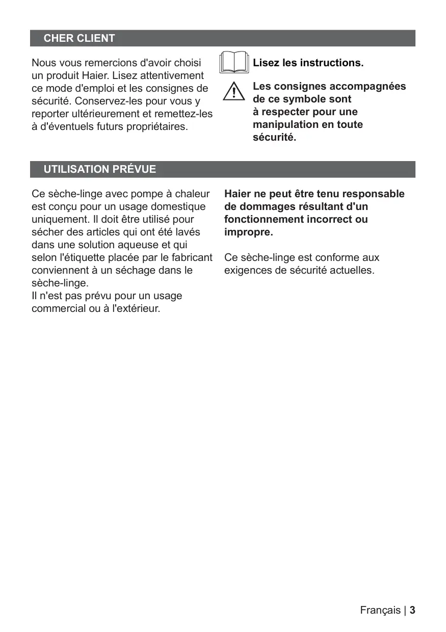 Ce sèche-linge avec pompe à chaleur est conçu pour un usage domestique uniquement. Il doit être utilisé pour sécher des articles qui ont été lavés dans une solution aqueuse et qui selon l'étiquette placée par le fabricant conviennent à un séchage dans le sèche-linge. Il n'est pas prévu pour un usage commercial ou à l'extérieur. Haier ne peut être tenu responsable de dommages résultant d'un fonctionnement incorrect ou impropre. Ce sèche-linge est conforme aux exigences de sécurité actuelles. Français | 3