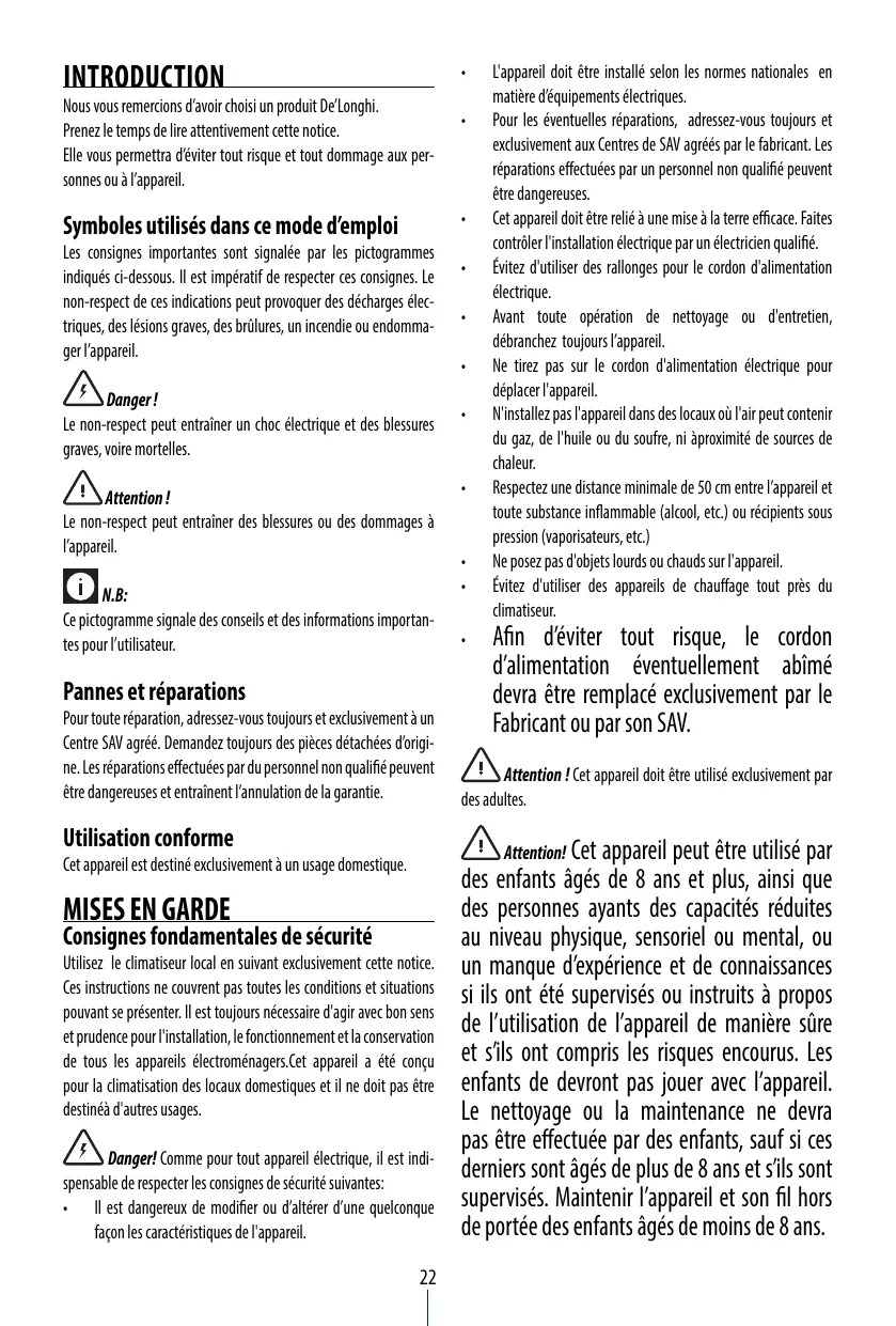 L'appareil doit être installé selon les normes nationales en matière d’équipements électriques. Pour les éventuelles réparations, adressez-vous toujours et exclusivement aux Centres de SAV agréés par le fabricant. Les réparations effectuées par un personnel non qualifié peuvent être dangereuses. Cet appareil doit être relié à une mise à la terre efficace. Faites contrôler l'installation électrique par un électricien qualifié. Évitez d'utiliser des rallonges pour le cordon d'alimentation électrique. Avant toute opération de nettoyage ou d'entretien, débranchez toujours l’appareil. Ne tirez pas sur le cordon d'alimentation électrique pour déplacer l'appareil. N'installez pas l'appareil dans des locaux où l'air peut contenir du gaz, de l'huile ou du soufre, ni àproximité de sources de chaleur. Respectez une distance minimale de 50 cm entre l’appareil et toute substance inflammable (alcool, etc.) ou récipients sous pression (vaporisateurs, etc.) Ne posez pas d'objets lourds ou chauds sur l'appareil. Évitez d'utiliser des appareils de chauffage tout près du climatiseur. Afin d’éviter tout risque, le cordon d’alimentation éventuellement abîmé devra être remplacé exclusivement par le Fabricant ou par son SAV. Attention ! Cet appareil doit être utilisé exclusivement par des adultes. Attention! Cet appareil peut être utilisé par des enfants âgés de 8 ans et plus, ainsi que des personnes ayants des capacités réduites au niveau physique, sensoriel ou mental, ou un manque d’expérience et de connaissances si ils ont été supervisés ou instruits à propos de l’utilisation de l’appareil de manière sûre et s’ils ont compris les risques encourus. Les enfants de devront pas jouer avec l’appareil. Le nettoyage ou la maintenance ne devra pas être effectuée par des enfants, sauf si ces derniers sont âgés de plus de 8 ans et s’ils sont supervisés. Maintenir l’appareil et son fil hors de portée des enfants âgés de moins de 8 ans.
