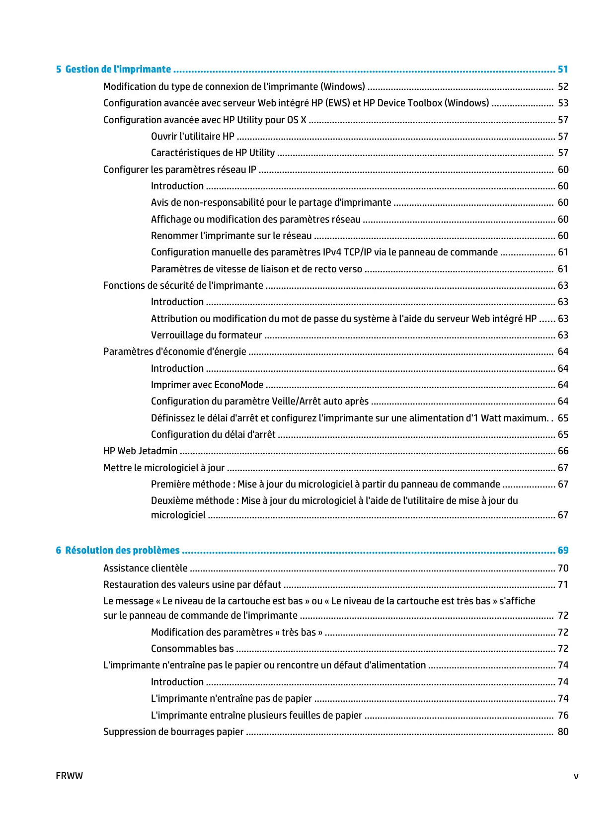 5 Gestion de l'imprimante 51 Modification du type de connexion de l'imprimante (Windows) 52 Configuration avancée avec serveur Web intégré HP (EWS) et HP Device Toolbox (Windows) 53 Configuration avancée avec HP Utility pour OS X 57 Ouvrir l'utilitaire HP 57 Caractéristiques de HP Utility 57 Configurer les paramètres réseau IP 60 Introduction 60 Avis de non-responsabilité pour le partage d'imprimante 60 Affichage ou modification des paramètres réseau 60 Renommer l'imprimante sur le réseau 60 Configuration manuelle des paramètres IPv4 TCP/IP via le panneau de commande 61 Paramètres de vitesse de liaison et de recto verso 61 Fonctions de sécurité de l'imprimante 63 Introduction 63 Attribution ou modification du mot de passe du système à l'aide du serveur Web intégré HP 63 Verrouillage du formateur 63 Paramètres d'économie d'énergie 64 Introduction 64 Imprimer avec EconoMode 64 Configuration du paramètre Veille/Arrêt auto après 64 Définissez le délai d'arrêt et configurez l'imprimante sur une alimentation d'1 Watt maximum. . 65 Configuration du délai d'arrêt 65 HP Web Jetadmin 66 Mettre le micrologiciel à jour 67 Première méthode : Mise à jour du micrologiciel à partir du panneau de commande 67 Deuxième méthode : Mise à jour du micrologiciel à l'aide de l'utilitaire de mise à jour du micrologiciel 67 6 Résolution des problèmes 69 Assistance clientèle 70 Restauration des valeurs usine par défaut 71 Le message « Le niveau de la cartouche est bas » ou « Le niveau de la cartouche est très bas » s'affiche sur le panneau de commande de l'imprimante 72 Modification des paramètres « très bas » 72 Consommables bas 72 L'imprimante n'entraîne pas le papier ou rencontre un défaut d'alimentation 74 Introduction 74 L'imprimante n'entraîne pas de papier 74 L'imprimante entraîne plusieurs feuilles de papier 76 Suppression de bourrages papier 80