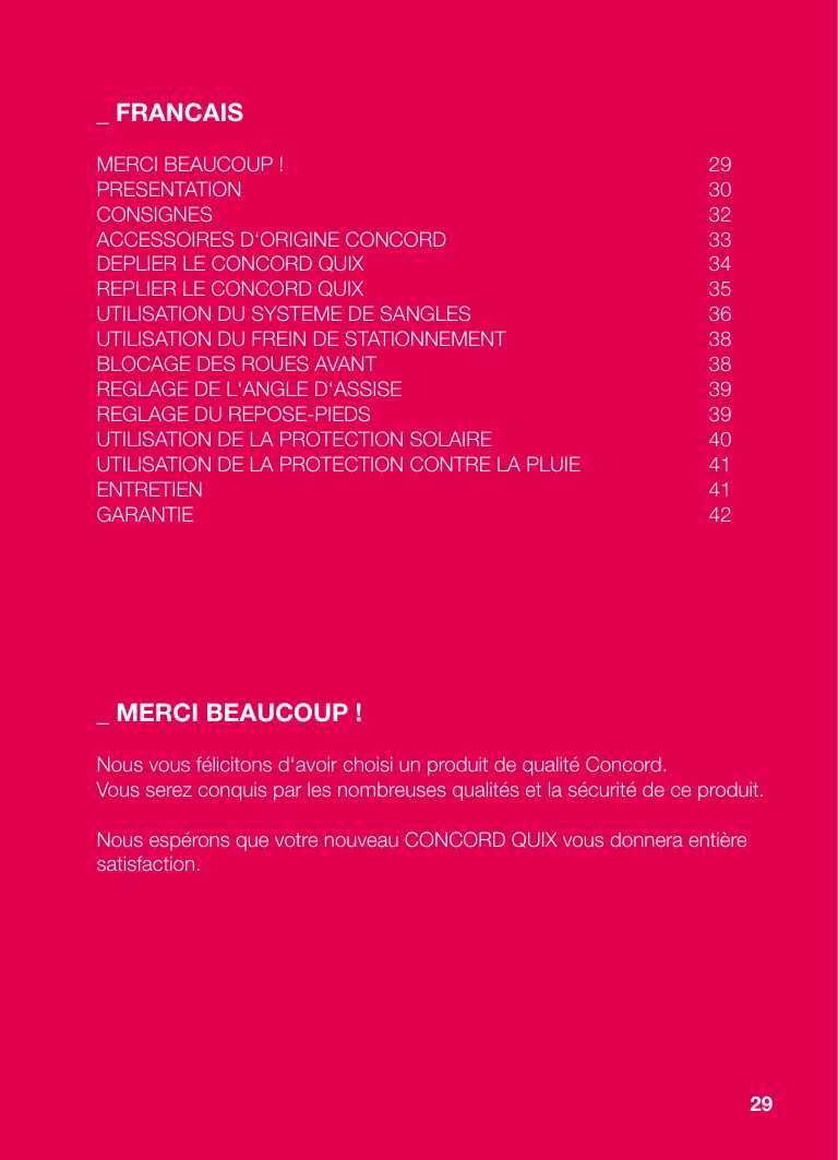 _ Merci beaucoup ! Nous vous félicitons d‘avoir choisi un produit de qualité Concord. Vous serez conquis par les nombreuses qualités et la sécurité de ce produit. Nous espérons que votre nouveau CONCORD QUIX vous donnera entière satisfaction.