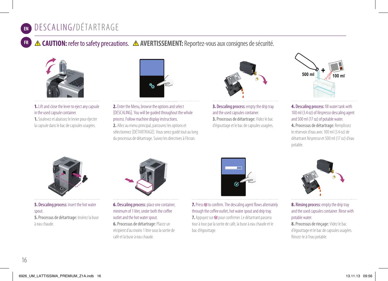 et abaissez le levier pour éjecter la capsule dans le bac de capsules usagées. Clean Clean 15” 15” 15” 15” 15” INFORMATION: rinse the milk system after each use. INFORMATION: Rincez le système de mousse de lait après chaque utilisation.
