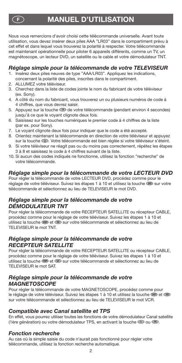 Nous vous remercions d’avoir choisi cette télécommande universelle. Avant toute utilisation, vous devez insérer deux piles AAA ”LR03” dans le compartiment prévu à cet effet et dans lequel vous trouverez la polarité à respecter. Votre télécommande est maintenant opérationnelle pour piloter 6 appareils différents, comme un TV, un magnétoscope, un lecteur DVD, un satellite ou le cable et votre démodulateur TNT. Réglage simple pour la télécommande de votre TELEVISEUR