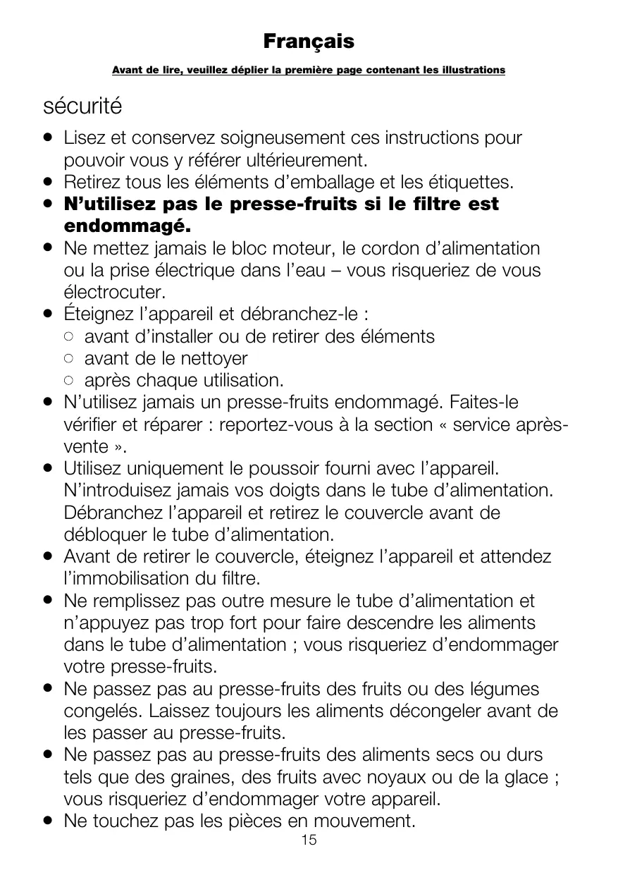 Retirez tous les éléments d’emballage et les étiquettes. N’utilisez pas le presse-fruits si le filtre est endommagé. Ne mettez jamais le bloc moteur, le cordon d’alimentation ou la prise électrique dans l’eau – vous risqueriez de vous électrocuter. Éteignez l’appareil et débranchez-le : avant d’installer ou de retirer des éléments avant de le nettoyer après chaque utilisation. N’utilisez jamais un presse-fruits endommagé. Faites-le vérifier et réparer : reportez-vous à la section « service aprèsvente ». Utilisez uniquement le poussoir fourni avec l’appareil. N’introduisez jamais vos doigts dans le tube d’alimentation. Débranchez l’appareil et retirez le couvercle avant de débloquer le tube d’alimentation. Avant de retirer le couvercle, éteignez l’appareil et attendez l’immobilisation du filtre. Ne remplissez pas outre mesure le tube d’alimentation et n’appuyez pas trop fort pour faire descendre les aliments dans le tube d’alimentation ; vous risqueriez d’endommager votre presse-fruits. Ne passez pas au presse-fruits des fruits ou des légumes congelés. Laissez toujours les aliments décongeler avant de les passer au presse-fruits. Ne passez pas au presse-fruits des aliments secs ou durs tels que des graines, des fruits avec noyaux ou de la glace ; vous risqueriez d’endommager votre appareil. Ne touchez pas les pièces en mouvement. 15