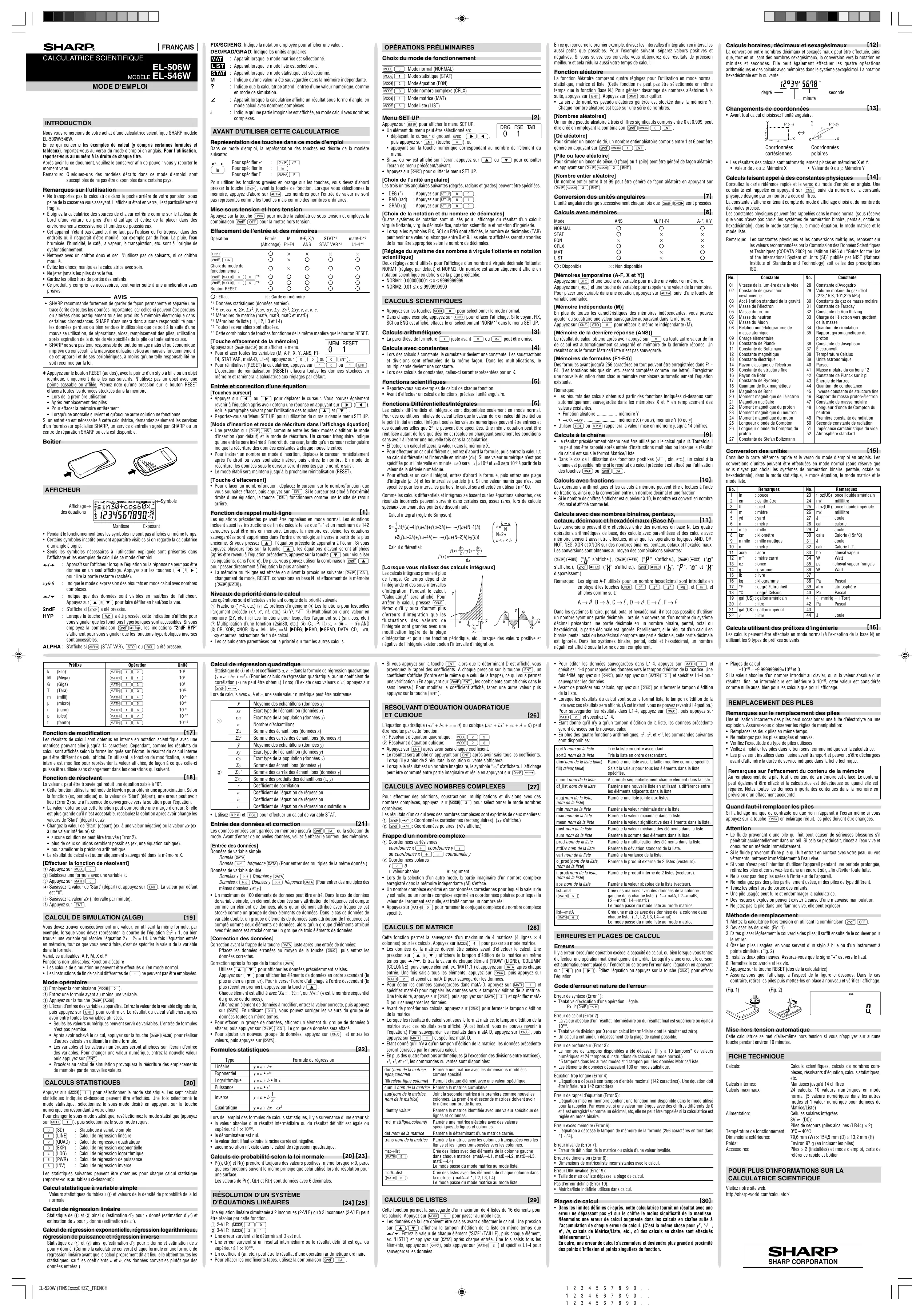 FRANÇAIS CALCULATRICE SCIENTIFIQUE MODÈLE EL-506W EL-546W MODE D’EMPLOI INTRODUCTION Nous vous remercions de votre achat d’une calculatrice scientifique SHARP modèle EL-506W/546W. En ce qui concerne les exemples de calcul (y compris certaines formules et tableaux), reportez-vous au verso du mode d’emploi en anglais. Pour l’utilisation, reportez-vous au numéro à la droite de chaque titre. Après avoir lu ce document, veuillez le conserver afin de pouvoir vous y reporter le moment venu. Remarque: Quelques-uns des modèles décrits dans ce mode d’emploi sont susceptibles de ne pas être disponibles dans certains pays.
