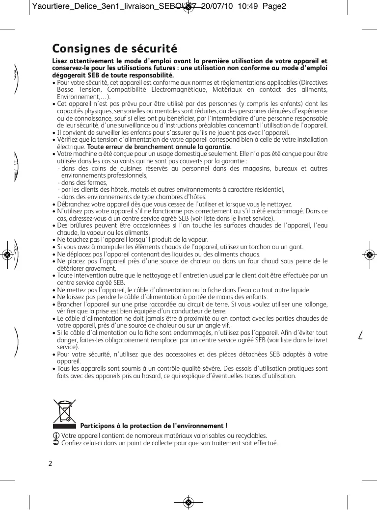 Yaourtiere_Delice_3en1_livraison_SEBOU87 20/07/10 10:49 PageD Yaourtiere_Delice_3en1_livraison_SEBOU87 20/07/10 10:49 Page2 Consignes de sécurité Lisez attentivement le mode d’emploi avant la première utilisation de votre appareil et conservez-le pour les utilisations futures : une utilisation non conforme au mode d’emploi dégagerait SEB de toute responsabilité.