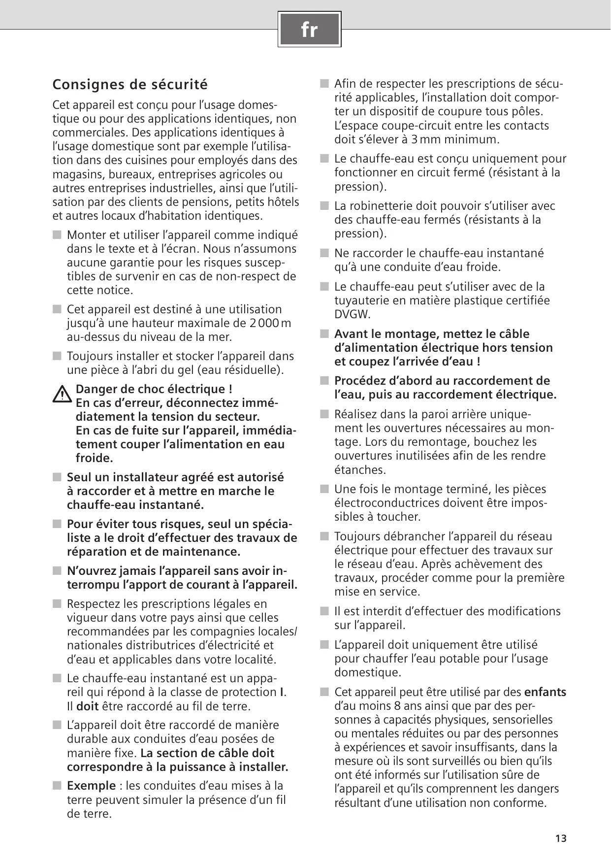 Consignes de sécurité Cet appareil est conçu pour l’usage domestique ou pour des applications identiques, non commerciales. Des applications identiques à l’usage domestique sont par exemple l’utilisation dans des cuisines pour employés dans des magasins, bureaux, entreprises agricoles ou autres entreprises industrielles, ainsi que l’utilisation par des clients de pensions, petits hôtels et autres locaux d’habitation identiques. ■ Monter et utiliser l’appareil comme indiqué dans le texte et à l’écran. Nous n’assumons aucune garantie pour les risques susceptibles de survenir en cas de non-respect de cette notice. ■ Cet appareil est destiné à une utilisation jusqu’à une hauteur maximale de 2 000 m au-dessus du niveau de la mer. ■ Toujours installer et stocker l’appareil dans une pièce à l’abri du gel (eau résiduelle). Danger de choc électrique ! En cas d’erreur, déconnectez immédiatement la tension du secteur. En cas de fuite sur l’appareil, immédiatement couper l’alimentation en eau froide. ■ Seul un installateur agréé est autorisé à raccorder et à mettre en marche le chauffe-eau instantané. ■ Pour éviter tous risques, seul un spécialiste a le droit d’effectuer des travaux de réparation et de maintenance. ■ Nʼouvrez jamais l’appareil sans avoir interrompu l’apport de courant à l’appareil. ■ Respectez les prescriptions légales en vigueur dans votre pays ainsi que celles recommandées par les compagnies locales/ nationales distributrices d’électricité et d’eau et applicables dans votre localité. ■ Le chauffe-eau instantané est un appareil qui répond à la classe de protection I. Il doit être raccordé au fil de terre. ■ L’appareil doit être raccordé de manière durable aux conduites d’eau posées de manière fixe. La section de câble doit correspondre à la puissance à installer. ■ Exemple : les conduites d’eau mises à la terre peuvent simuler la présence d’un fil de terre. ■ Afin de respecter les prescriptions de sécurité applicables, l’installation doit comporter un dispositif de coupure tous pôles. L’espace coupe-circuit entre les contacts doit s’élever à 3 mm minimum. ■ Le chauffe-eau est conçu uniquement pour fonctionner en circuit fermé (résistant à la pression). ■ La robinetterie doit pouvoir s’utiliser avec des chauffe-eau fermés (résistants à la pression). ■ Ne raccorder le chauffe-eau instantané qu’à une conduite d’eau froide. ■ Le chauffe-eau peut s’utiliser avec de la tuyauterie en matière plastique certifiée DVGW. ■ Avant le montage, mettez le câble d’alimentation électrique hors tension et coupez l’arrivée d’eau ! ■ Procédez d’abord au raccordement de l’eau, puis au raccordement électrique. ■ Réalisez dans la paroi arrière uniquement les ouvertures nécessaires au montage. Lors du remontage, bouchez les ouvertures inutilisées afin de les rendre étanches. ■ Une fois le montage terminé, les pièces électroconductrices doivent être impossibles à toucher. ■ Toujours débrancher l’appareil du réseau électrique pour effectuer des travaux sur le réseau d’eau. Après achèvement des travaux, procéder comme pour la première mise en service. ■ Il est interdit d’effectuer des modifications sur l’appareil. ■ L’appareil doit uniquement être utilisé pour chauffer l’eau potable pour l’usage domestique. ■ Cet appareil peut être utilisé par des enfants d’au moins 8 ans ainsi que par des personnes à capacités physiques, sensorielles ou mentales réduites ou par des personnes à expériences et savoir insuffisants, dans la mesure où ils sont surveillés ou bien qu’ils ont été informés sur l’utilisation sûre de l’appareil et qu’ils comprennent les dangers résultant d’une utilisation non conforme.