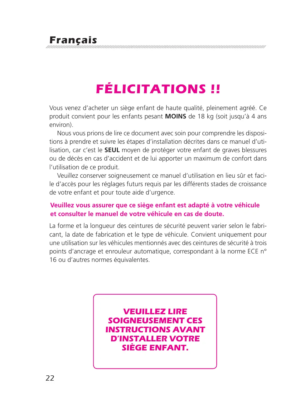 fÉLICITATIONS !! Vous venez d’acheter un siège enfant de haute qualité, pleinement agréé. Ce produit convient pour les enfants pesant MOINS de 18 kg (soit jusqu’à 4 ans environ). Nous vous prions de lire ce document avec soin pour comprendre les dispositions à prendre et suivre les étapes d’installation décrites dans ce manuel d’utilisation, car c’est le SEUL moyen de protéger votre enfant de graves blessures ou de décès en cas d’accident et de lui apporter un maximum de confort dans l’utilisation de ce produit. Veuillez conserver soigneusement ce manuel d’utilisation en lieu sûr et facile d’accès pour les réglages futurs requis par les différents stades de croissance de votre enfant et pour toute aide d’urgence. Veuillez vous assurer que ce siège enfant est adapté à votre véhicule et consulter le manuel de votre véhicule en cas de doute. La forme et la longueur des ceintures de sécurité peuvent varier selon le fabricant, la date de fabrication et le type de véhicule. Convient uniquement pour une utilisation sur les véhicules mentionnés avec des ceintures de sécurité à trois points d’ancrage et enrouleur automatique, correspondant à la norme ECE n° 16 ou d’autres normes équivalentes.