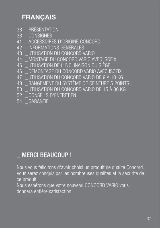 _ GARANTIE _ MERCI BEAUCOUP ! Nous vous félicitons d‘avoir choisi un produit de qualité Concord. Vous serez conquis par les nombreuses qualités et la sécurité de ce produit. Nous espérons que votre nouveau CONCORD VARIO vous donnera entière satisfaction.