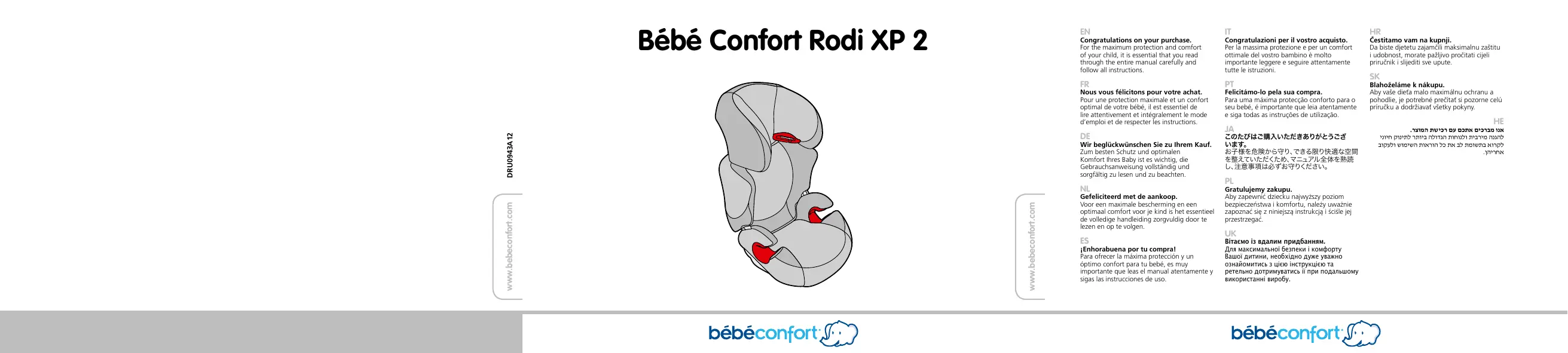 6. Always install both components of the Bébé Confort Rodi XP 2: seat + back support. 2. Ne tenez jamais votre enfant sur les genoux pendant les déplacements en voiture. 3. Utilisez le siège-auto Bébé Confort Rodi XP 2 uniquement dans la voiture. 4. N’utilisez pas de produit d’occasion dont vous ignorez s’il a subi des dommages (visibles ou non). 5. Remplacez le siège-auto Bébé Confort Rodi XP 2 après un accident. 6. Veuillez lire attentivement la notice et la conserver précieusement dans le compartiment de rangement sous le siège-auto Bébé Confort Rodi XP 2.