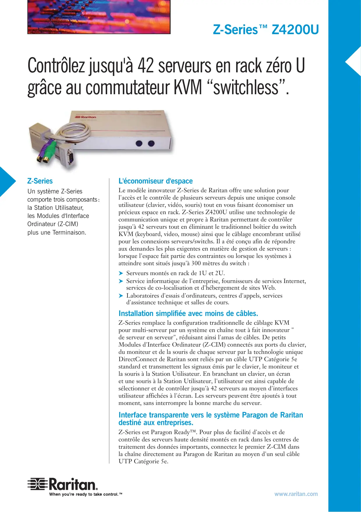 Z-Series est Paragon Ready™. Pour plus de facilité d'accès et de contrôle des serveurs haute densité montés en rack dans les centres deTraitement des données importantes, connectez le premier Z-CIM dansla chaîne directement au Paragon de Raritan au moyen d'un seul cable UTP Catégorie 5e.