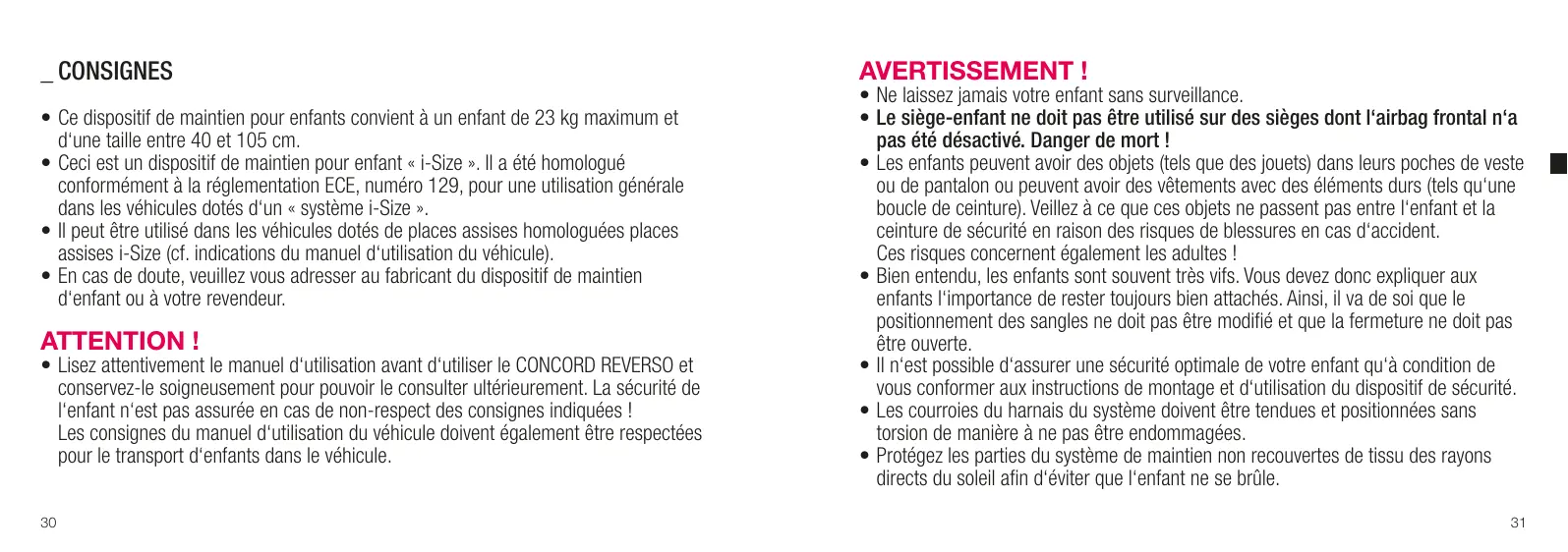• Lisez attentivement le manuel d‘utilisation avant d‘utiliser le CONCORD REVERSO et conservez-le soigneusement pour pouvoir le consulter ultérieurement. La sécurité de l‘enfant n‘est pas assurée en cas de non-respect des consignes indiquées ! Les consignes du manuel d‘utilisation du véhicule doivent également être respectées pour le transport d‘enfants dans le véhicule.