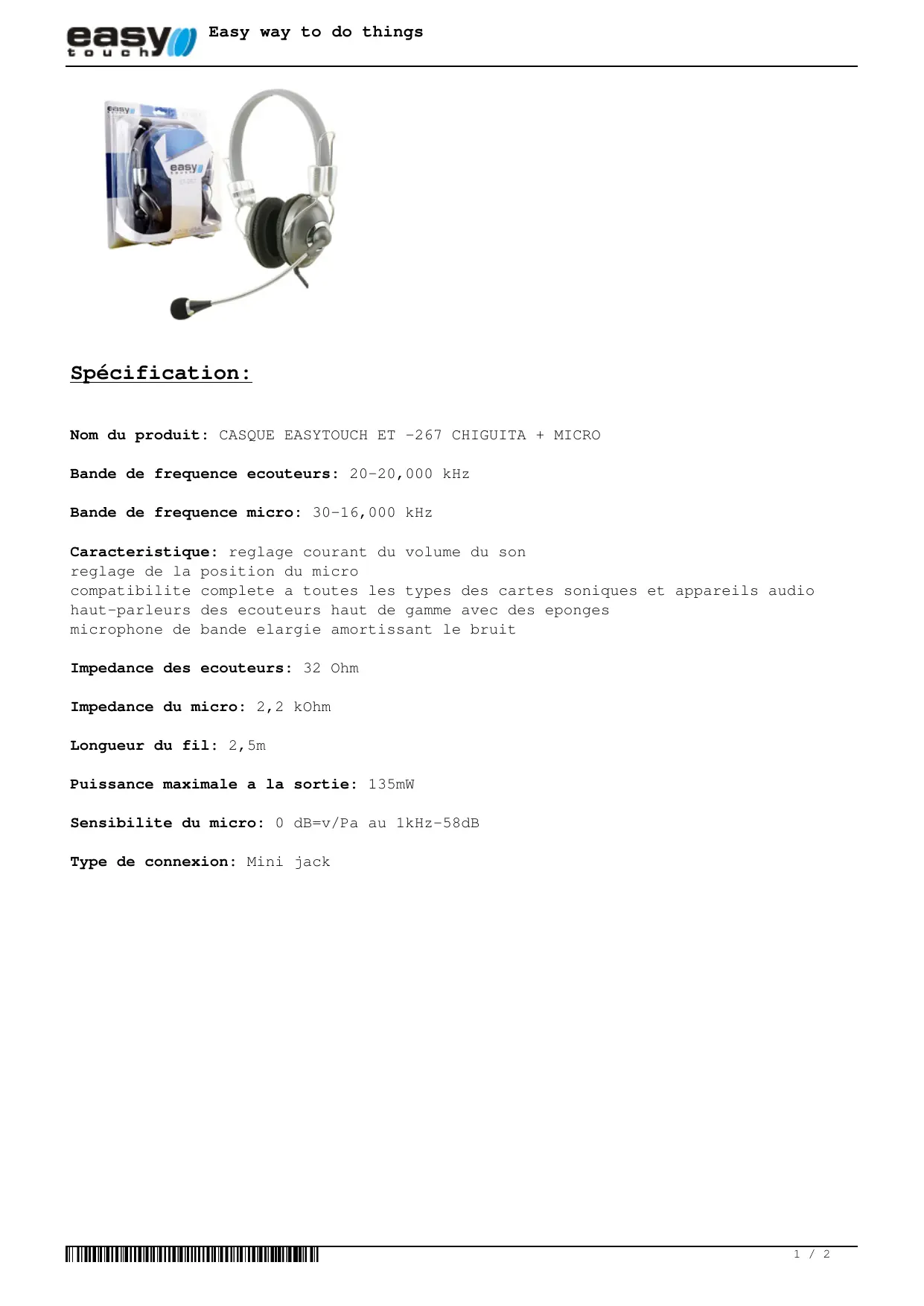 Nom du produit : CASQUE EASYTOUCH ET-267 CHIGUITA + MICRO
