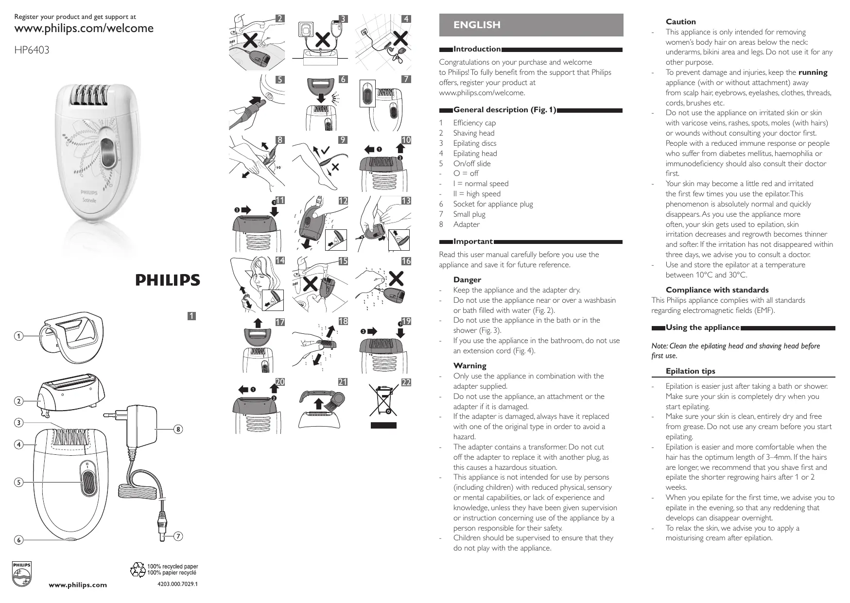 Ne rincez jamais l’appareil ni l’adaptateur sous le robinet (fig. 15). Évitez de mouiller l’appareil et l’adaptateur secteur (fig. 16). Nettoyage de la tête d’épilation et de l’adaptateur efficace 1 Retirez l’adaptateur efficace de la tête d’épilation (fig. 17). 2 Poussez la tête d’épilation dans le sens des flèches à l’arrière de l’appareil (1), puis détachez-la de l’appareil (2) (fig. 10). 3 Rincez la tête d’épilation et l’adaptateur efficace sous l’eau du robinet en les faisant tourner. 4 Secouez énergiquement la tête d’épilation (fig. 18). 5 Séchez soigneusement la tête d’épilation avec une serviette. Remarque : Assurez-vous que la tête d’épilation et l’adaptateur efficace sont complètement secs avant de les replacer sur l’appareil. 6 Replacez la tête d’épilation sur l’appareil (1), puis poussez-la dans le sens des flèches à l’arrière de l’appareil (2) jusqu’à ce qu’elle s’enclenche (clic) (fig. 19). Nettoyage de la tête de rasage 1 Éteignez l’appareil. 2 Débranchez l’adaptateur de la prise secteur (1), puis retirez la petite fiche de l’appareil (2). 3 Poussez la tête de rasage dans le sens de la flèche (1), puis retirez-la de l’appareil (2). (fig. 20) 4 Retirez la grille de la tête de rasage (fig. 21). 5 Nettoyez la grille de rasage, le bloc tondeuse et le compartiment à poils à l’aide de la brosse de nettoyage. N’exercez aucune pression sur la grille de rasage afin d’éviter toute détérioration. 6 Vous pouvez également rincer la tête de rasage et ses composants sous l’eau du robinet. 7 Appliquez une goutte d’huile pour machine à coudre sur la grille de rasage deux fois par an. Commande d’accessoires Pour acheter des accessoires pour cet appareil, rendez-vous sur notre site Web www.philips.com/ shop. Si vous rencontrez des difficultés pour obtenir des accessoires pour votre appareil, contactez le Service Consommateurs Philips de votre pays. Vous en trouverez les coordonnées dans le dépliant de garantie internationale. Vous pouvez également consulter le site Web www.philips.com/support. Environnement