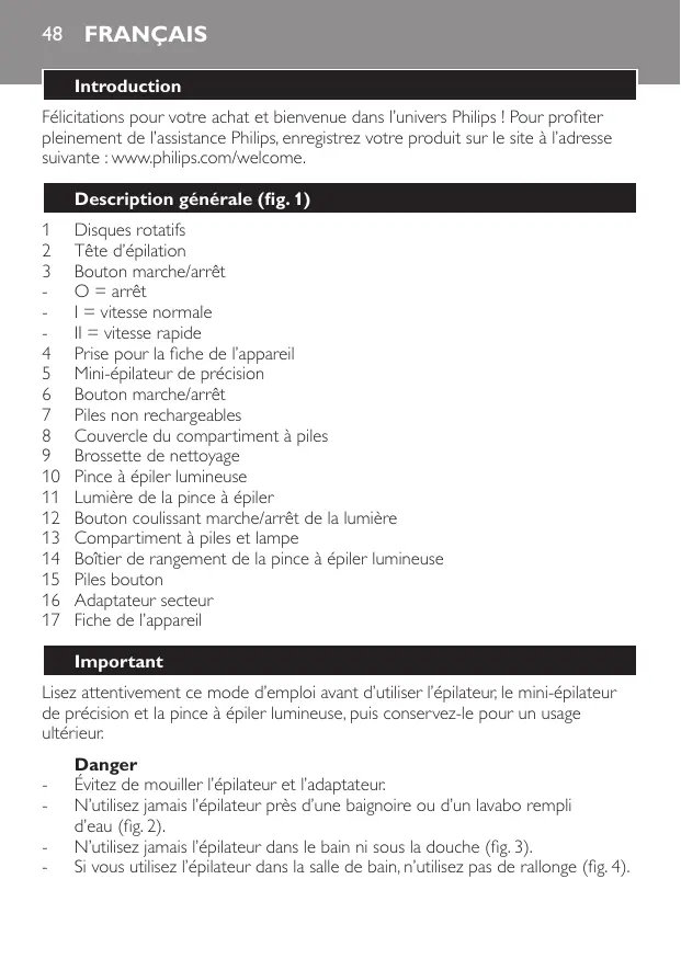 Avertissement Évitez de mouiller le mini-épilateur de précision et la pince à épiler lumineuse. Utilisez toujours l’épilateur avec l’adaptateur secteur fourni. N’utilisez pas l’épilateur, le mini-épilateur de précision, la pince à épiler lumineuse et l’adaptateur s’ils sont endommagés. Si l’adaptateur secteur est endommagé, il doit toujours être remplacé par un adaptateur secteur de même type pour éviter tout accident. Avant de brancher l’épilateur, vérifiez que la tension indiquée sur ce dernier correspond à la tension du secteur. N’essayez pas de remplacer la fiche de l’adaptateur afin d’éviter tout accident. L’épilateur, le mini-épilateur de précision et la pince à épiler lumineuse ne sont pas destinés à être utilisés par des personnes (notamment des enfants) dont les capacités physiques, sensorielles ou intellectuelles sont réduites, ou par des personnes manquant d’expérience ou de connaissances, à moins que celles-ci ne soient sous surveillance ou qu’elles n’aient reçu des instructions quant à l’utilisation des appareils par une personne responsable de leur sécurité. Veillez à ce que les enfants ne puissent pas jouer avec l’épilateur, le miniépilateur de précision et la pince à épiler lumineuse. Gardez les piles bouton de la pince à épiler lumineuse hors de portée des enfants et des animaux car elles pourraient les étouffer. Attention L’épilateur est exclusivement destiné à l’élimination des poils féminins situés sur les jambes. Le mini-épilateur de précision est destiné à l’épilation des poils féminins au niveau des aisselles et du maillot, des zones difficiles d’accès telles que les genoux et les chevilles. N’utilisez pas ces appareils à d’autres fins que celles-ci. Pour des raisons d’hygiène, l’épilateur, le mini-épilateur de précision et la pince à épiler lumineuse doivent être utilisés par une seule et unique personne. Pour prévenir tout dommage ou blessure, évitez de faire fonctionner l’appareil près de vos cheveux, de vos sourcils et cils, ainsi qu’à proximité de vêtements, fils, câbles, brosses, etc. N’utilisez pas les appareils et la pince à épiler lumineuse sur une peau irritée ou présentant des varices, rougeurs, boutons, grains de beauté (avec pilosité) ou blessures sans avoir consulté votre médecin. Les mêmes recommandations s’appliquent aux personnes ayant une immunité réduite ou souffrant de diabète, d’hémophilie ou d’une immunodéficience. Lors des premières utilisations, il est possible que la peau rougisse ou s’irrite légèrement. Il s’agit d’une réaction normale qui disparaîtra rapidement. La gêne ressentie au début diminuera progressivement à chaque utilisation. Au fur et à