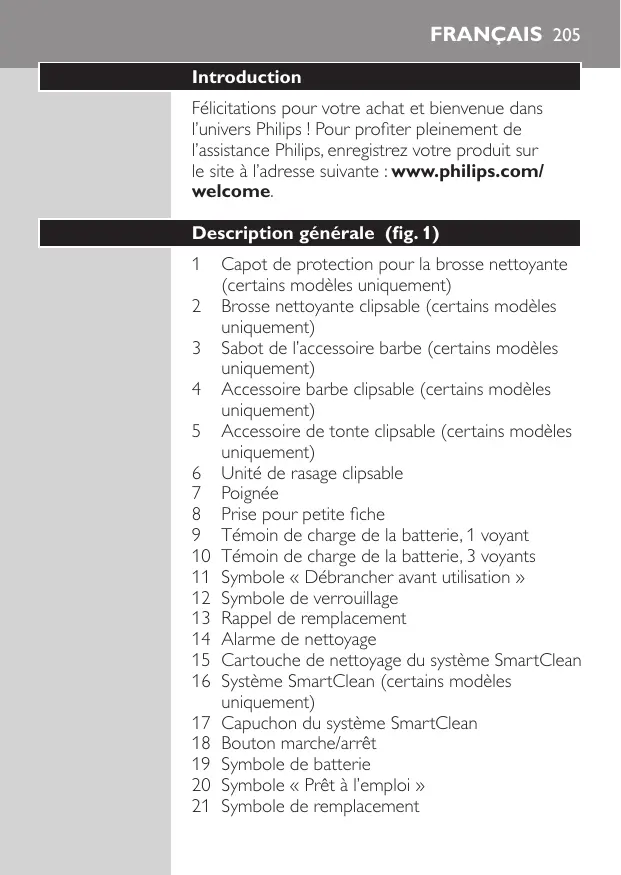 FRANÇAIS 205 Introduction Félicitations pour votre achat et bienvenue dans l’univers Philips ! Pour profiter pleinement de l’assistance Philips, enregistrez votre produit sur le site à l’adresse suivante : www.philips.com/ welcome. Description générale (fig. 1)