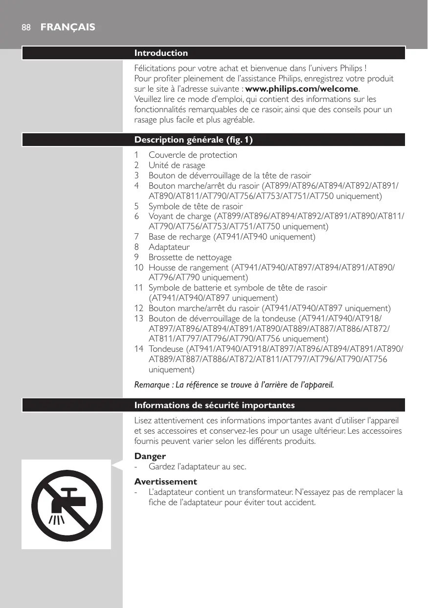 Couvercle de protection Unité de rasage Bouton de déverrouillage de la tête de rasoir Bouton marche/arrêt du rasoir (AT899/AT896/AT894/AT892/AT891/ AT890/AT811/AT790/AT756/AT753/AT751/AT750 uniquement) Symbole de tête de rasoir Voyant de charge (AT899/AT896/AT894/AT892/AT891/AT890/AT811/ AT790/AT756/AT753/AT751/AT750 uniquement) Base de recharge (AT941/AT940 uniquement) Adaptateur Brossette de nettoyage Housse de rangement (AT941/AT940/AT897/AT894/AT891/AT890/ AT796/AT790 uniquement) Symbole de batterie et symbole de tête de rasoir (AT941/AT940/AT897 uniquement) Bouton marche/arrêt du rasoir (AT941/AT940/AT897 uniquement) Bouton de déverrouillage de la tondeuse (AT941/AT940/AT918/ AT897/AT896/AT894/AT891/AT890/AT889/AT887/AT886/AT872/ AT811/AT797/AT796/AT790/AT756 uniquement) Tondeuse (AT941/AT940/AT918/AT897/AT896/AT894/AT891/AT890/ AT889/AT887/AT886/AT872/AT811/AT797/AT796/AT790/AT756 uniquement) Remarque : La référence se trouve à l’arrière de l’appareil. Informations de sécurité importantes Lisez attentivement ces informations importantes avant d’utiliser l’appareil et ses accessoires et conservez-les pour un usage ultérieur. Les accessoires fournis peuvent varier selon les différents produits. Danger -- Gardez l’adaptateur au sec. Avertissement -- L’adaptateur contient un transformateur. N’essayez pas de remplacer la fiche de l’adaptateur pour éviter tout accident. FRANÇAIS