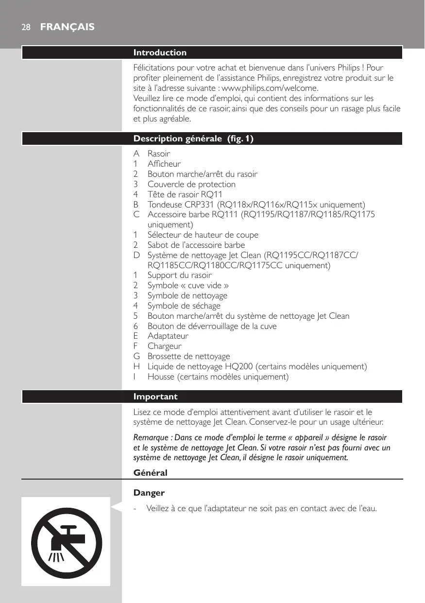 Afficheur Bouton marche/arrêt du rasoir Couvercle de protection Tête de rasoir RQ11 Tondeuse CRP331 (RQ118x/RQ116x/RQ115x uniquement) Accessoire barbe RQ111 (RQ1195/RQ1187/RQ1185/RQ1175 uniquement) 1 Sélecteur de hauteur de coupe 2 Sabot de l’accessoire barbe D Système de nettoyage Jet Clean (RQ1195CC/RQ1187CC/ RQ1185CC/RQ1180CC/RQ1175CC uniquement) 1 Support du rasoir 2 Symbole « cuve vide » 3 Symbole de nettoyage 4 Symbole de séchage 5 Bouton marche/arrêt du système de nettoyage Jet Clean 6 Bouton de déverrouillage de la cuve E Adaptateur F Chargeur G Brossette de nettoyage H Liquide de nettoyage HQ200 (certains modèles uniquement) I Housse (certains modèles uniquement) Important Lisez ce mode d’emploi attentivement avant d’utiliser le rasoir et le système de nettoyage Jet Clean. Conservez-le pour un usage ultérieur. Remarque : Dans ce mode d’emploi le terme « appareil » désigne le rasoir et le système de nettoyage Jet Clean. Si votre rasoir n’est pas fourni avec un système de nettoyage Jet Clean, il désigne le rasoir uniquement. Général Danger -- Veillez à ce que l’adaptateur ne soit pas en contact avec de l’eau.