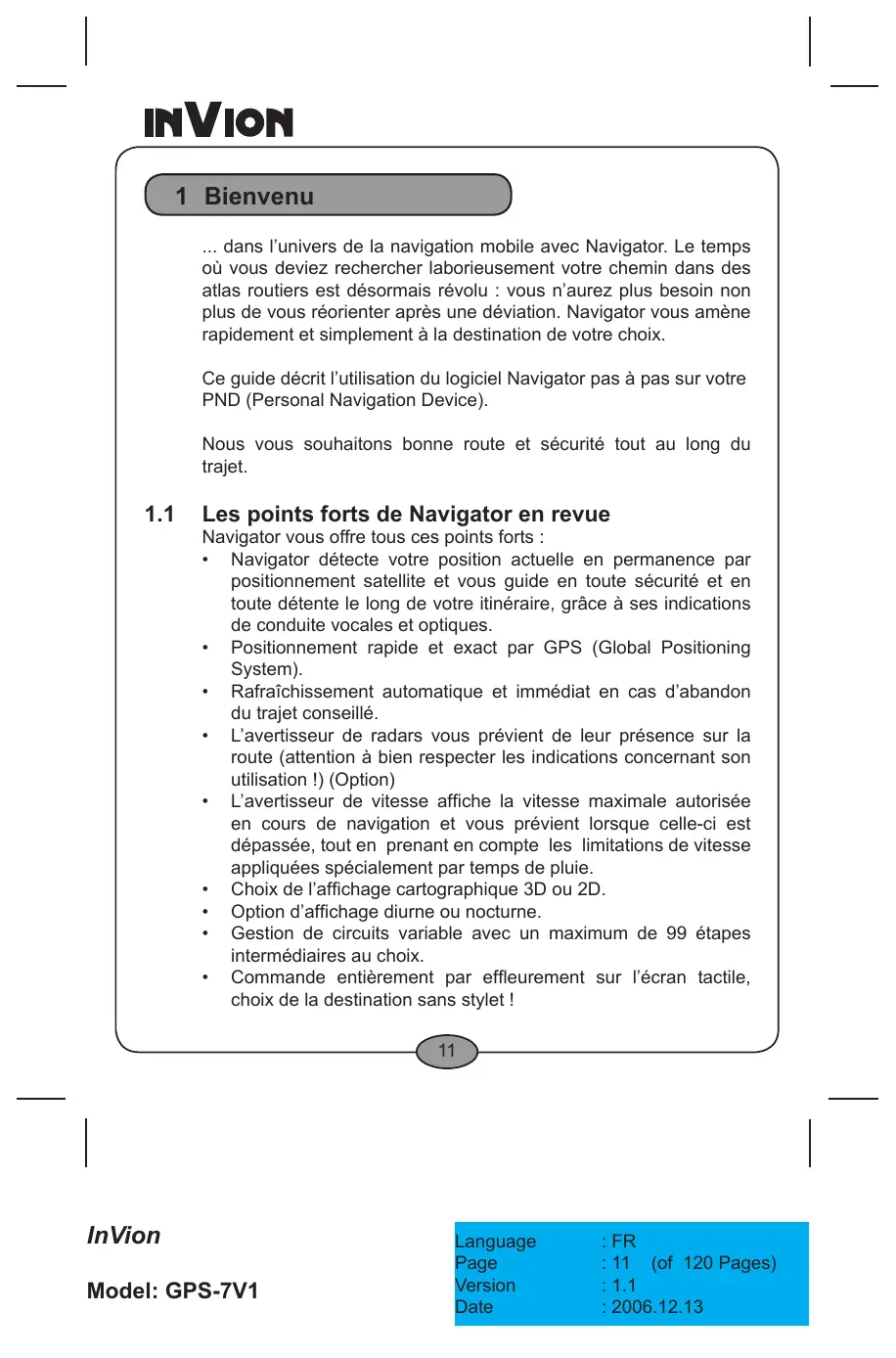 InVion Model: GPS-7V1 Language Page Version Date : FR : (of 120 Pages) : 1.1 : 2006.12.13 FRANÇAIS