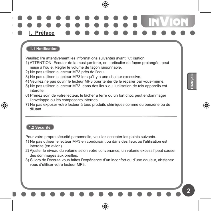 1) Ne pas utiliser le lecteur MP3 en conduisant ou dans des lieux ou l’utilisation est