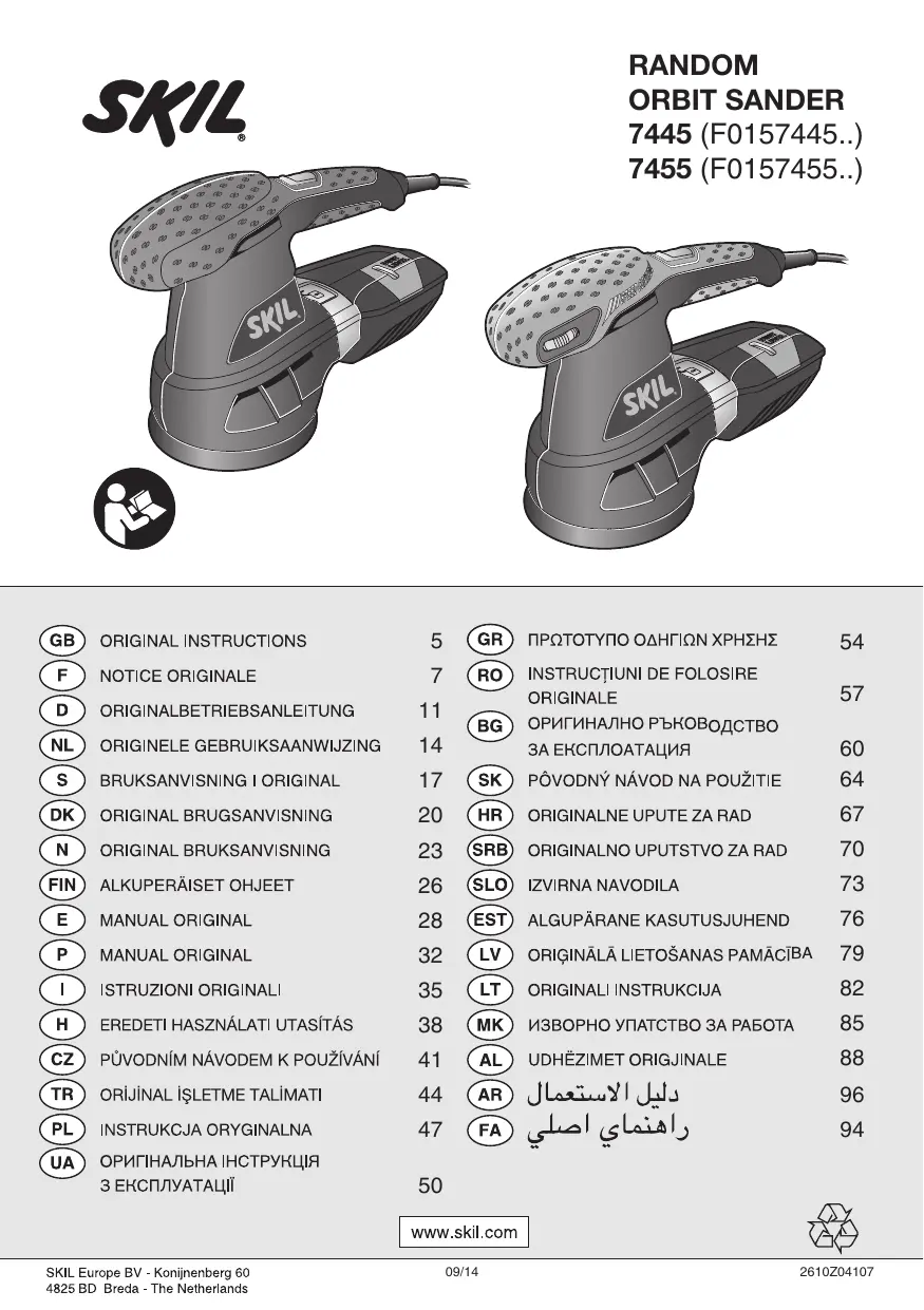 • -- éliminez les poussières de ponçage qui adhèrent à l'outil avec un pinceau !! débranchez la fiche avant le nettoyage Si, malgré tous les soins apportés à la fabrication et au contrôle de l’outil, celui ci devait avoir un défaut, la réparation ne doit être confiée qu’à une station de service après-vente agréée pour outillage SKIL -- retournez l’outil non démonté avec votre preuve d’achat au revendeur ou au centre de service aprèsvente SKIL le plus proche (les adresses ainsi que la vue éclatée de l’outil figurent sur www.skil.com)