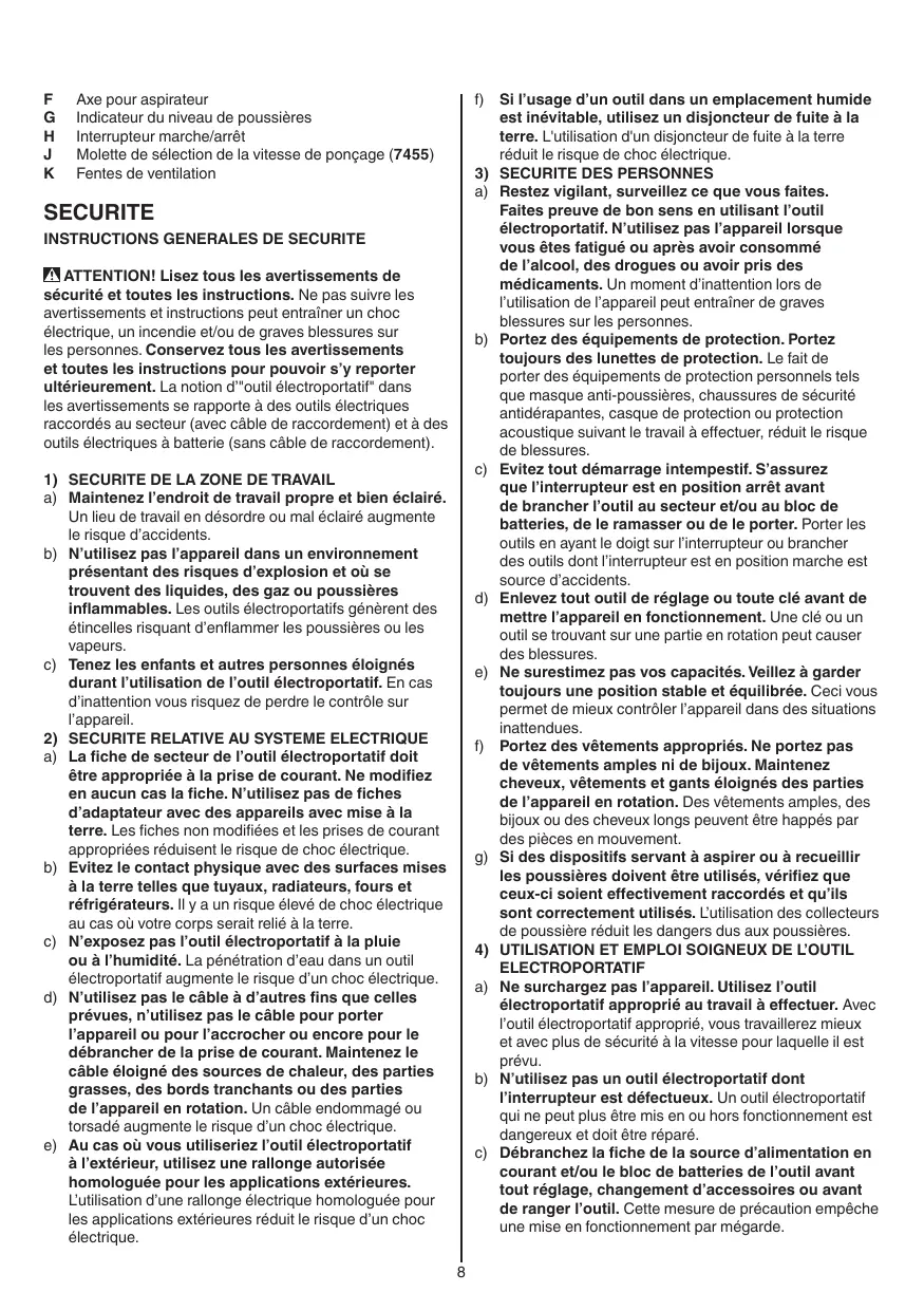 Aspiration de poussières 5 -- videz le réservoir à poussière D régulièrement pour une récupération optimale des poussières En cas d’utilisation d’un aspirateur -- retirez le réservoir à poussière D en poussant le bouton E vers la gauche et en le maintenant dans cette position tout en tirant le réservoir à poussière D vers l'arrière -- montez l’aspirateur sur l’axe F !! n'utilisez pas le réservoir à poussière/l’aspirateur pour le ponçage des métaux Indicateur du niveau de poussières 6 -- videz le réservoir à poussière D lorsque l’indicateur G devient ROUGE -- l'indicateur G ne fonctionne que quand l'outil est branché -- notez que le fonctionnement de l'indicateur de niveau de poussières n'est pas garanti pour le ponçage à des réglages de vitesse inférieurs (7455) Interrupteur marche/arrêt -- mettez en marche/arrêtez votre outil en poussant l’interrupteur H 2 vers l’avant/l’arrière !! l’outil doit être mis en marche avant que la surface de ponçage ne touche la pièce à poncer !! méfiez-vous de l’impact brusque de la puissance à la mise en marche de l’outil !! avant d’arrêter l'outil, vous devriez le soulever de la pièce à travailler Contrôle de la vitesse 7 (7455) Afin d’obtenir les meilleurs résultats sur toutes les surfaces -- la molette J 2 vous permet de régler la vitesse de ponçage désirée -- ajustez toujours la vitesse en fonction de la surface à poncer -- avant de commencer un travail, trouvez la vitesse et grain approprié et poncez sur une petite surface pour tester l’efficacité Tenue et guidage de l’outil 8 !! lorsque vous travaillez, tenez toujours l'outil par la(les) zone(s) de couleur grise -- guidez votre outil parallèle à la surface de travail en effectuant un mouvement circulaire ou en croix -- ne pas appuyez trop fortement sur l'outil; laissez l'outil travailler pour vous -- n'inclinez pas trop l'outil pour éviter toute marque de ponçage -- veillez à ce que les fentes de ventilation K 2 soient découvertes Poncer -- l’effet abrasif dépend également du choix de la feuille de ponçage, de la vitesse de ponçage présélectionnée ainsi que de la pression exercée sur l’outil !! une pression trop élevée exercée sur l’outil n’améliore pas la puissance de ponçage mais augmente considérablement l’usure de l’outil et de la feuille de ponçage !! ne jamais travaillez le bois et le métal avec une même feuille de ponçage