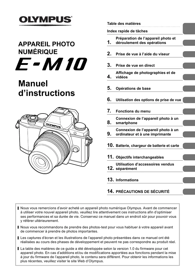 Nous vous remercions d’avoir acheté un appareil photo numérique Olympus. Avant de commencer à utiliser votre nouvel appareil photo, veuillez lire attentivement ces instructions afin d’optimiser ses performances et sa durée de vie. Conservez ce manuel dans un endroit sûr pour pouvoir vous y référer ultérieurement. Nous vous recommandons de prendre des photos-test pour vous habituer à votre appareil avant de commencer à prendre de photos importantes. Les captures d’écran et les illustrations de l’appareil photo présentées dans ce manuel ont été réalisées au cours des phases de développement et peuvent ne pas correspondre au produit réel. La table des matières de ce guide a été développée selon la version 1.0 du firmware pour cet appareil photo. En cas d’additions et/ou de modifications apportées aux fonctions pendant la mise à jour du firmware de l’appareil photo, le contenu sera différent. Pour obtenir les informations les plus récentes, veuillez visiter le site Web d’Olympus. Table des matières Table des matières Index rapide de tâches
