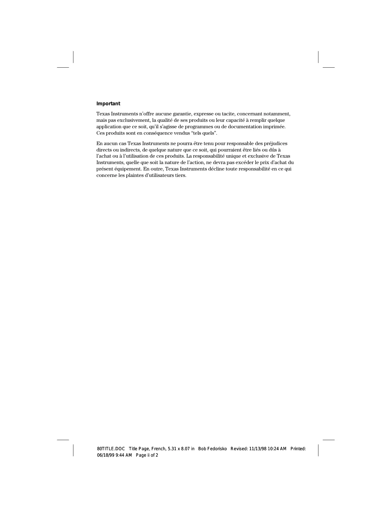 Vérification de la mémoire disponible ................ 12-2 Suppression des données en mémoire ................ 12-3 Réinitialisation de la TI-80 ........................ 12-4 Annexe A :Tableaux et informations de référence Tableau des fonctions et instructions de la TI-80 ........ A-2 Organisation des menus .......................... A-20 Variables de la TI-80 ............................ A-26 Annexe B :Entretien et garantie Entretien des piles .............................. B-2 Précision des calculs ............................ B-8 En cas de problème ............................. B-10 Conditions d'erreur ............................. B-11 Informations sur les services et la garantie TI ........... B-14 Index vi Introduction 80TOC.DOC TOC, French, 5.31 x 8.07 in Bob Fedorisko Revised: 11/13/98 1:50 PM Printed: 06/18/99 9:45 AM Page vi of 8 Présentation du manuel La structure du manuel d'utilisation de la TI-80 et sa présentation doivent vous permettre de trouver rapidement l'information dont vous avez besoin. Des conventions de mise en page ont été adoptées dans l'ensemble de ce manuel afin de clarifier et de faciliter son utilisation. Structure du manuel Le but de ce manuel est de vous apprendre à utiliser la calculatrice.