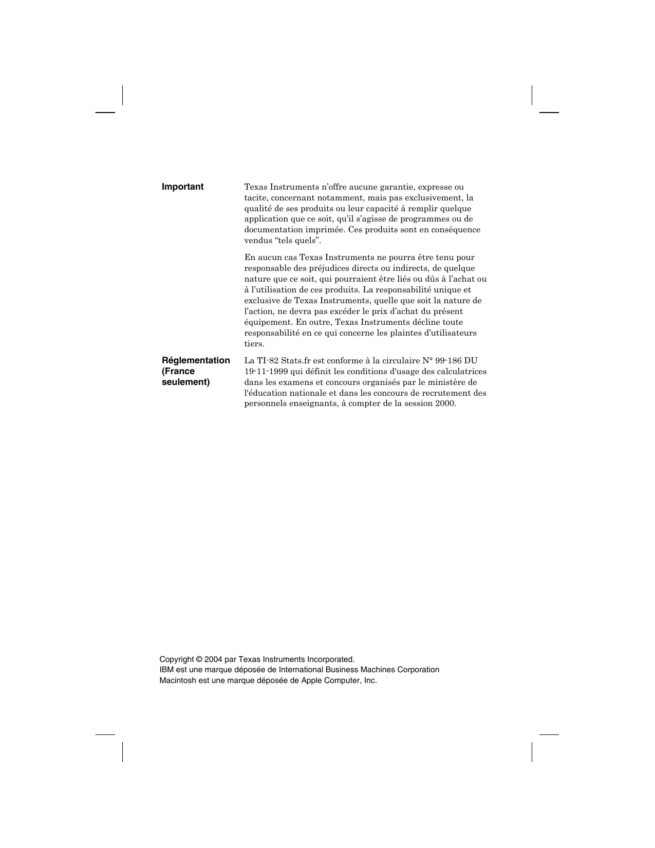 CALCULATRICE GRAPHIQUE MANUEL D’UTILISATION Important Texas Instruments n’offre aucune garantie, expresse ou tacite, concernant notamment, mais pas exclusivement, la qualité de ses produits ou leur capacité à remplir quelque application que ce soit, qu’il s’agisse de programmes ou de documentation imprimée. Ces produits sont en conséquence vendus “tels quels”. En aucun cas Texas Instruments ne pourra être tenu pour responsable des préjudices directs ou indirects, de quelque nature que ce soit, qui pourraient être liés ou dûs à l’achat ou à l’utilisation de ces produits. La responsabilité unique et exclusive de Texas Instruments, quelle que soit la nature de l’action, ne devra pas excéder le prix d’achat du présent équipement. En outre, Texas Instruments décline toute responsabilité en ce qui concerne les plaintes d’utilisateurs tiers. Réglementation (France seulement) La TI-82 Stats.fr est conforme à la circulaire N° 99-186 DU 19-11-1999 qui définit les conditions d'usage des calculatrices dans les examens et concours organisés par le ministère de l'éducation nationale et dans les concours de recrutement des personnels enseignants, à compter de la session 2000. Copyright © 2004 par Texas Instruments Incorporated. IBM est une marque déposée de International Business Machines Corporation Macintosh est une marque déposée de Apple Computer, Inc. Table des matières Ce manuel explique comment vous devez utiliser la calculatrice graphique TI-82 Stats.fr.fr. L’introduction “Vos débuts” présente rapidement ses principales fonctions et le chapitre 1 fournit des directives générales d’utilisation. Les autres chapitres décrivent les fonctions interactives de la TI-82 Stats.fr. Vous trouverez des exemples pratiques d’application et de combinaison de ces fonctions dans le