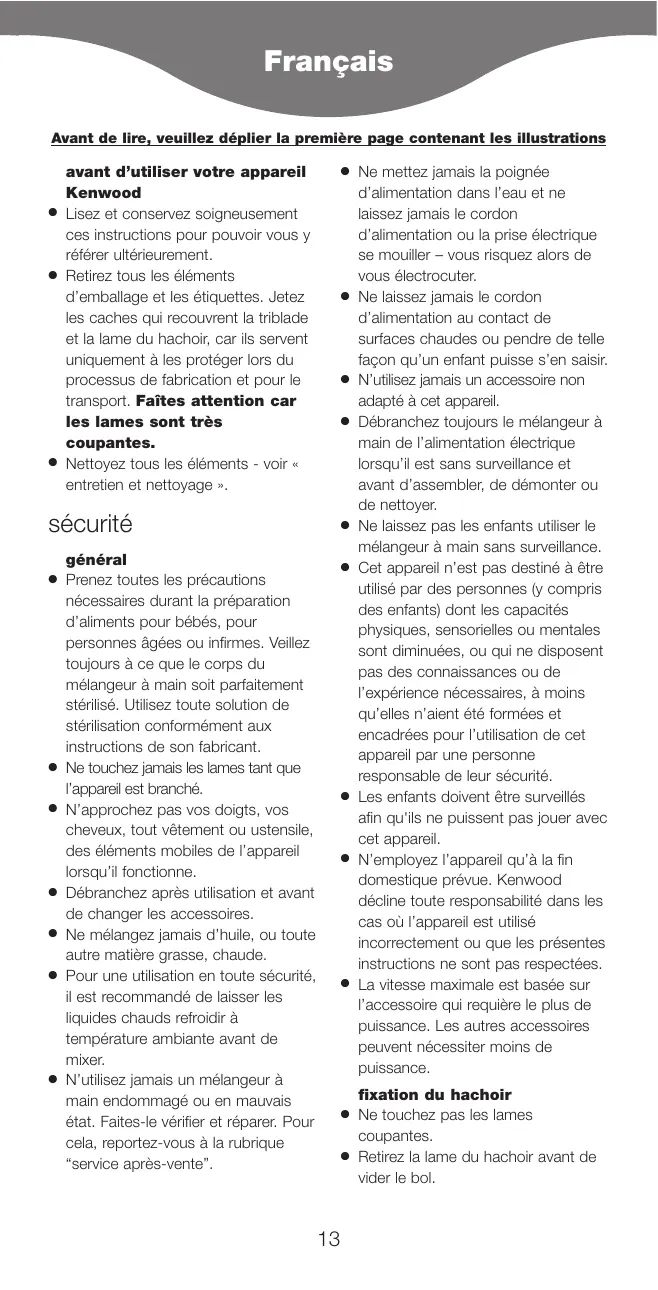 Ne mettez jamais la poignée d’alimentation dans l’eau et ne laissez jamais le cordon d’alimentation ou la prise électrique se mouiller – vous risquez alors de vous électrocuter. Ne laissez jamais le cordon d’alimentation au contact de surfaces chaudes ou pendre de telle façon qu’un enfant puisse s’en saisir. N’utilisez jamais un accessoire non adapté à cet appareil. Débranchez toujours le mélangeur à main de l’alimentation électrique lorsqu’il est sans surveillance et avant d’assembler, de démonter ou de nettoyer. Ne laissez pas les enfants utiliser le mélangeur à main sans surveillance. Cet appareil n’est pas destiné à être utilisé par des personnes (y compris des enfants) dont les capacités physiques, sensorielles ou mentales sont diminuées, ou qui ne disposent pas des connaissances ou de l’expérience nécessaires, à moins qu’elles n’aient été formées et encadrées pour l’utilisation de cet appareil par une personne responsable de leur sécurité. Les enfants doivent être surveillés afin qu'ils ne puissent pas jouer avec cet appareil. N’employez l’appareil qu’à la fin domestique prévue. Kenwood décline toute responsabilité dans les cas où l’appareil est utilisé incorrectement ou que les présentes instructions ne sont pas respectées. La vitesse maximale est basée sur l’accessoire qui requière le plus de puissance. Les autres accessoires peuvent nécessiter moins de puissance. fixation du hachoir Ne touchez pas les lames coupantes. Retirez la lame du hachoir avant de vider le bol.