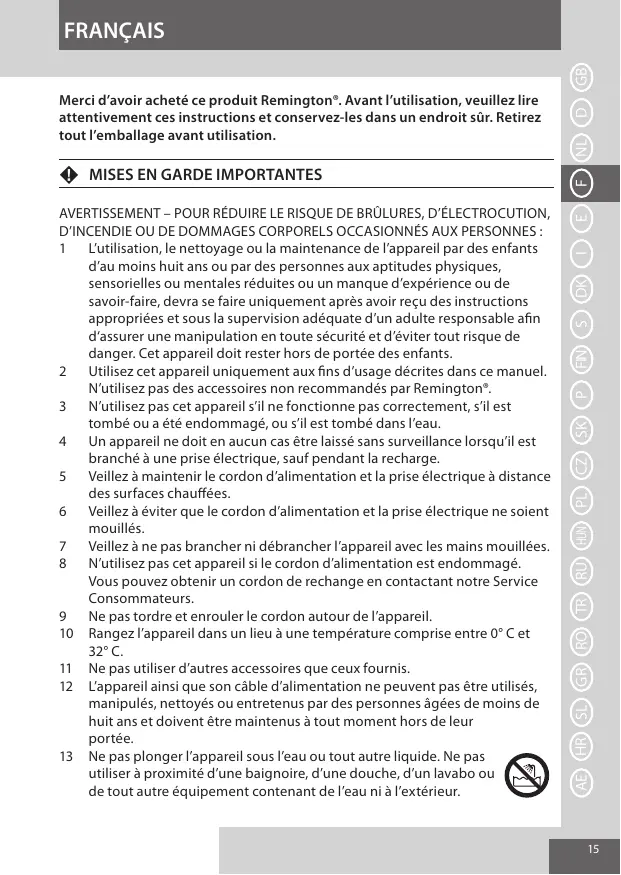 AVERTISSEMENT – POUR RÉDUIRE LE RISQUE DE BRÛLURES, D’ÉLECTROCUTION, D’INCENDIE OU DE DOMMAGES CORPORELS OCCASIONNÉS AUX PERSONNES : L’utilisation, le nettoyage ou la maintenance de l’appareil par des enfants d’au moins huit ans ou par des personnes aux aptitudes physiques, sensorielles ou mentales réduites ou un manque d’expérience ou de savoir-faire, devra se faire uniquement après avoir reçu des instructions appropriées et sous la supervision adéquate d’un adulte responsable afin d‘assurer une manipulation en toute sécurité et d’éviter tout risque de danger. Cet appareil doit rester hors de portée des enfants. Utilisez cet appareil uniquement aux fins d’usage décrites dans ce manuel. N’utilisez pas des accessoires non recommandés par Remington®. N’utilisez pas cet appareil s’il ne fonctionne pas correctement, s’il est tombé ou a été endommagé, ou s’il est tombé dans l’eau. Un appareil ne doit en aucun cas être laissé sans surveillance lorsqu’il est branché à une prise électrique, sauf pendant la recharge. Veillez à maintenir le cordon d’alimentation et la prise électrique à distance des surfaces chauffées. Veillez à éviter que le cordon d’alimentation et la prise électrique ne soient mouillés. Veillez à ne pas brancher ni débrancher l’appareil avec les mains mouillées. N’utilisez pas cet appareil si le cordon d’alimentation est endommagé. Vous pouvez obtenir un cordon de rechange en contactant notre Service Consommateurs. Ne pas tordre et enrouler le cordon autour de l’appareil. 10 Rangez l’appareil dans un lieu à une température comprise entre 0° C et 32° C. 11 Ne pas utiliser d’autres accessoires que ceux fournis. 12 L’appareil ainsi que son câble d’alimentation ne peuvent pas être utilisés, manipulés, nettoyés ou entretenus par des personnes âgées de moins de huit ans et doivent être maintenus à tout moment hors de leur portée. 13 Ne pas plonger l’appareil sous l’eau ou tout autre liquide. Ne pas utiliser à proximité d’une baignoire, d’une douche, d’un lavabo ou de tout autre équipement contenant de l’eau ni à l’extérieur.
