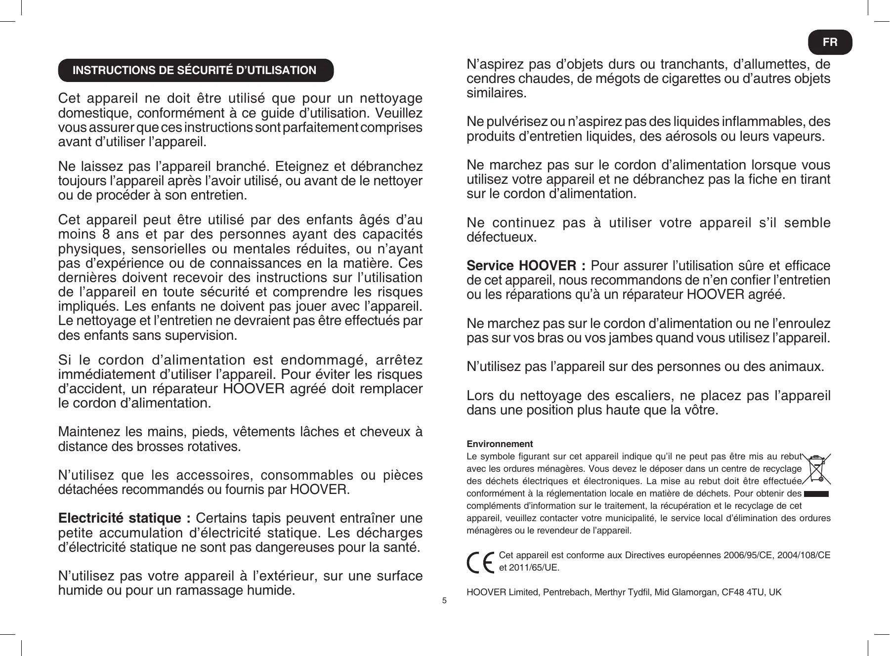 Service HOOVER : Pour assurer l’utilisation sûre et efficace de cet appareil, nous recommandons de n’en confier l’entretien ou les réparations qu’à un réparateur HOOVER agréé.