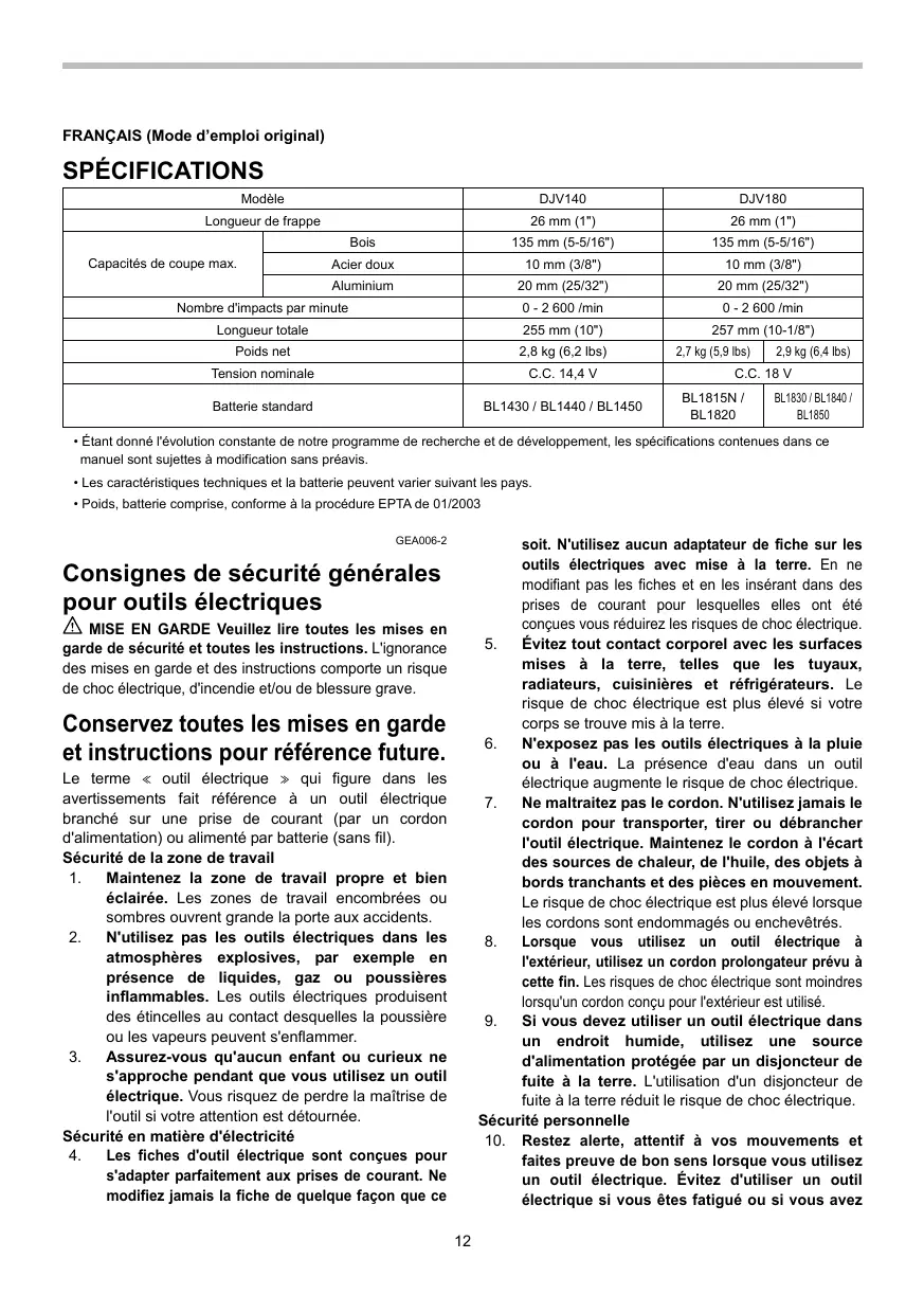 JVO600J - Outils électriques MAKITA - Notice d'utilisation et mode d'emploi gratuit