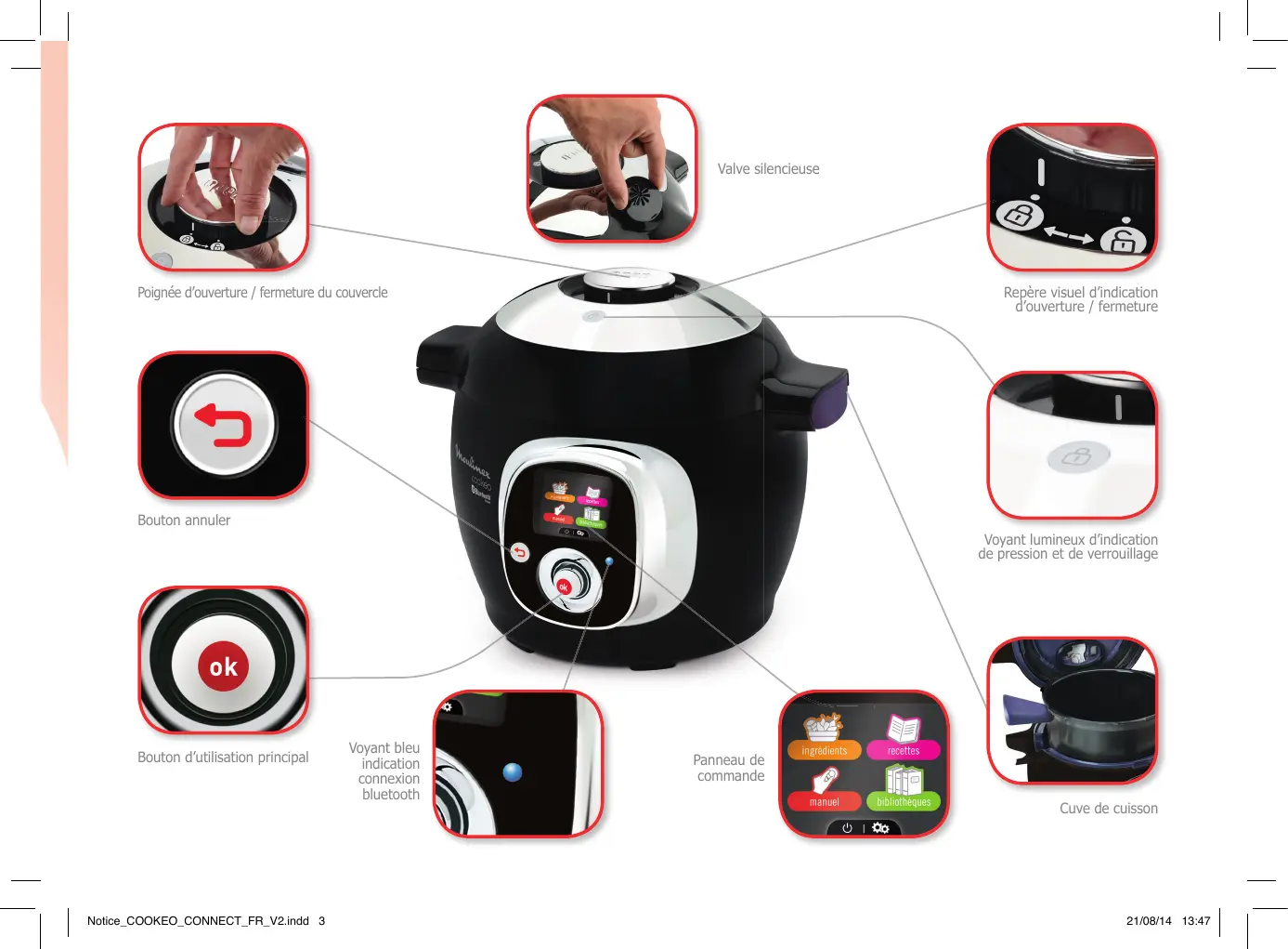 Chauffage intégré 21/08/14 13:47 Valve silencieuse Repère visuel d’indication d’ouverture / fermeture Poignée d’ouverture / fermeture du couvercle Bouton annuler Voyant lumineux d’indication de pression et de verrouillage Bouton d’utilisation principal Notice_COOKEO_CONNECT_FR_V2.indd 3 Voyant bleu indication connexion bluetooth Panneau de commande Cuve de cuisson 21/08/14 13:47 avant utilisation Sortez l’appareil de son emballage et lisez attentivement les instructions de fonctionnement et les consignes de sécurité avant d’utiliser le produit pour la première fois.