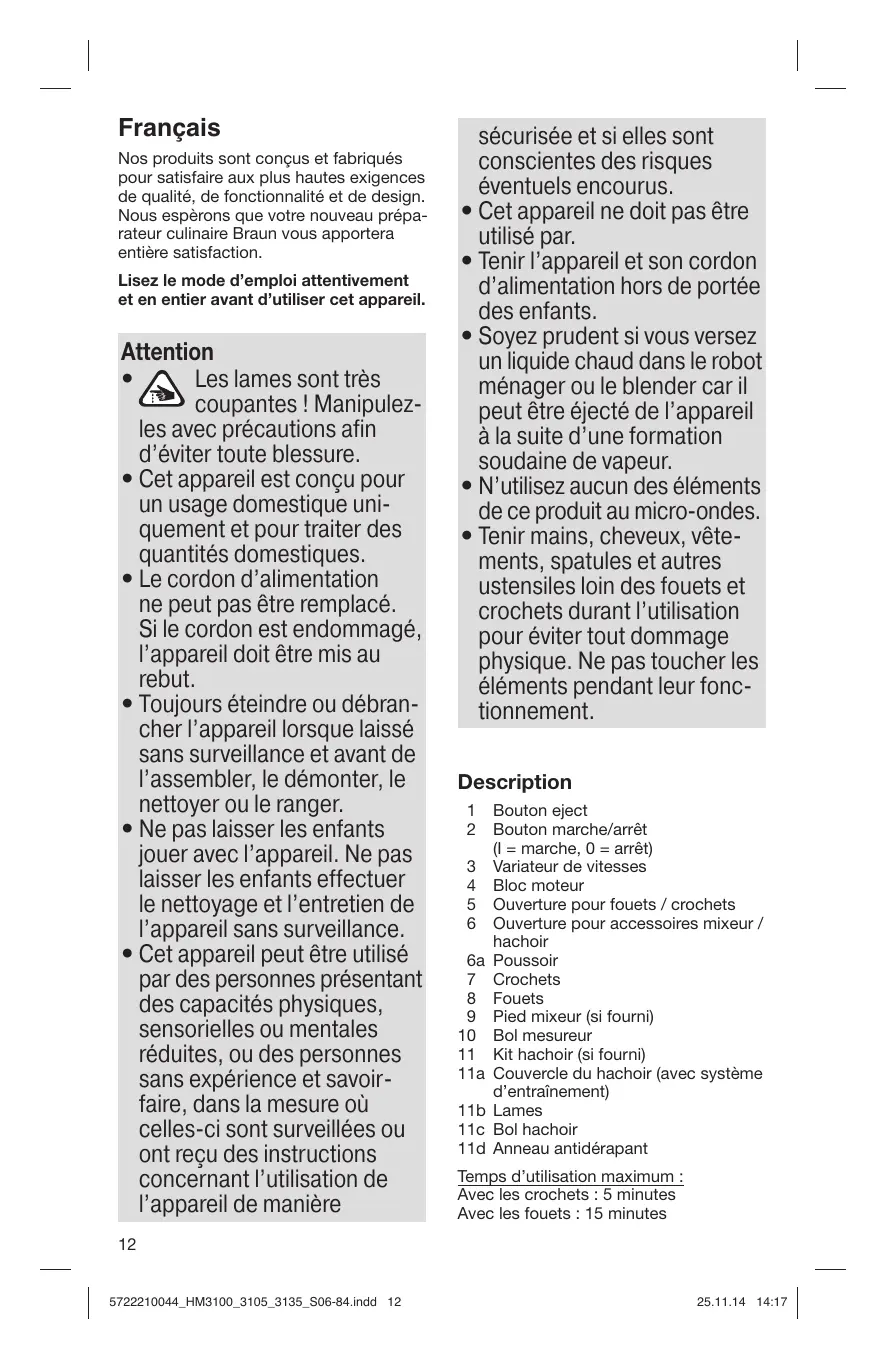 Nos produits sont conçus et fabriqués pour satisfaire aux plus hautes exigences de qualité, de fonctionnalité et de design. Nous espèrons que votre nouveau préparateur culinaire Braun vous apportera entière satisfaction. Lisez le mode d’emploi attentivement et en entier avant d’utiliser cet appareil.