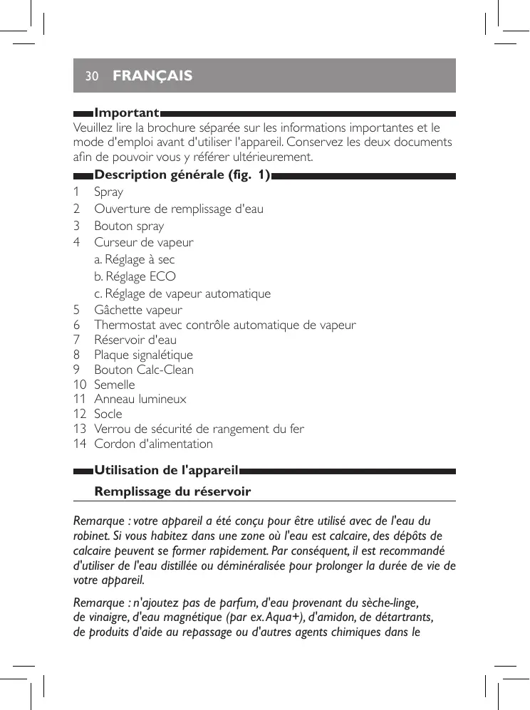 Important Veuillez lire la brochure séparée sur les informations importantes et le mode d'emploi avant d'utiliser l'appareil. Conservez les deux documents afin de pouvoir vous y référer ultérieurement. Description générale (fig. 1) 1 Spray 2 Ouverture de remplissage d'eau 3 Bouton spray 4 Curseur de vapeur a. Réglage à sec b. Réglage ECO c. Réglage de vapeur automatique 5 Gâchette vapeur 6 Thermostat avec contrôle automatique de vapeur 7 Réservoir d'eau 8 Plaque signalétique 9 Bouton Calc-Clean 10 Semelle 11 Anneau lumineux 12 Socle 13 Verrou de sécurité de rangement du fer 14 Cordon d'alimentation Utilisation de l'appareil Remplissage du réservoir Remarque : votre appareil a été conçu pour être utilisé avec de l'eau du robinet. Si vous habitez dans une zone où l'eau est calcaire, des dépôts de calcaire peuvent se former rapidement. Par conséquent, il est recommandé d'utiliser de l'eau distillée ou déminéralisée pour prolonger la durée de vie de votre appareil. Remarque : n'ajoutez pas de parfum, d'eau provenant du sèche-linge, de vinaigre, d'eau magnétique (par ex. Aqua+), d'amidon, de détartrants, de produits d'aide au repassage ou d'autres agents chimiques dans le