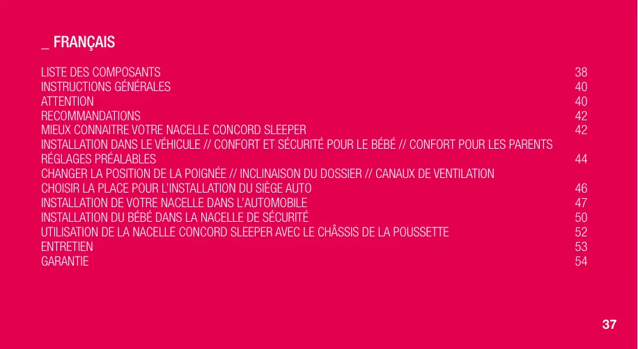 CONCORD AVEnUE CONCORD wAnDErEr CONCORD nEO _ FRANÇAIS Liste des composants Instructions générales Attention Recommandations Mieux connaitre votre nacelle CONCORD SLEEPER Installation dans le véhicule // Confort et sécurité pour le bébé // Confort pour les parents Réglages préalables Changer la position de la poignée // Inclinaison du dossier // Canaux de ventilation Choisir la place pour l’installation du siège auto Installation de votre nacelle dans l’automobile Installation du bébé dans la nacelle de sécurité Utilisation de la nacelle CONCORD SLEEPER avec le châssis de la poussette Entretien GARANTIE