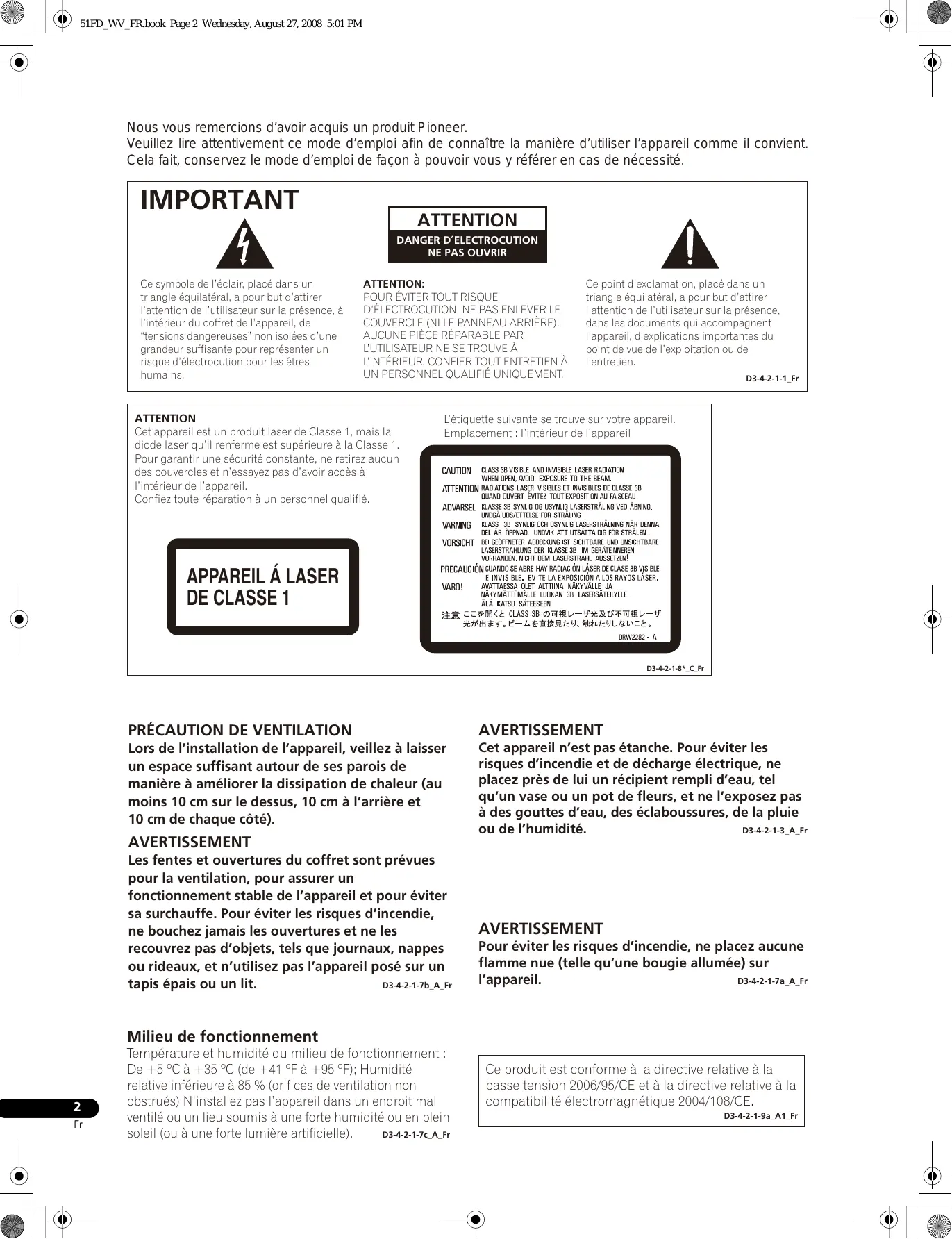 51FD_WV_FR.book Page 2 Wednesday, August 27, 2008 5:01 PM Nous vous remercions d’avoir acquis un produit Pioneer. Veuillez lire attentivement ce mode d’emploi afin de connaître la manière d’utiliser l’appareil comme il convient. Cela fait, conservez le mode d’emploi de façon à pouvoir vous y référer en cas de nécessité.