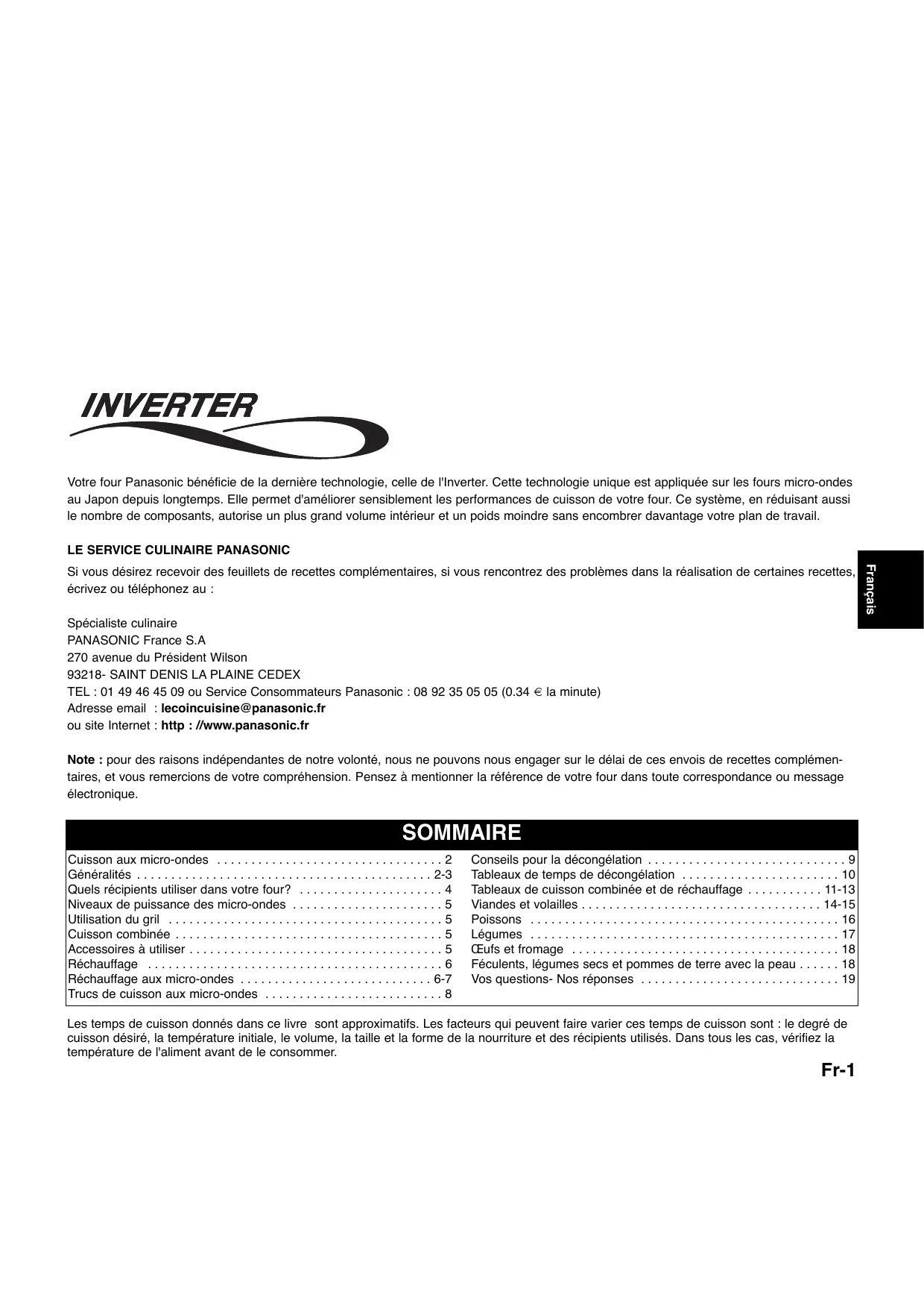 - TEL : 01 49 46 45 09 ou Service Consommateurs Panasonic : 08 92 35 05 05 (0.34 € la minute) Adresse email : lecoincuisine@panasonic.fr ou site Internet : http : //www.panasonic.fr Note : pour des raisons indépendantes de notre volonté, nous ne pouvons nous engager sur le délai de ces envois de recettes complémentaires, et vous remercions de votre compréhension. Pensez à mentionner la référence de votre four dans toute correspondance ou message électronique. SOMMAIRE Cuisson aux micro-ondes p. 2