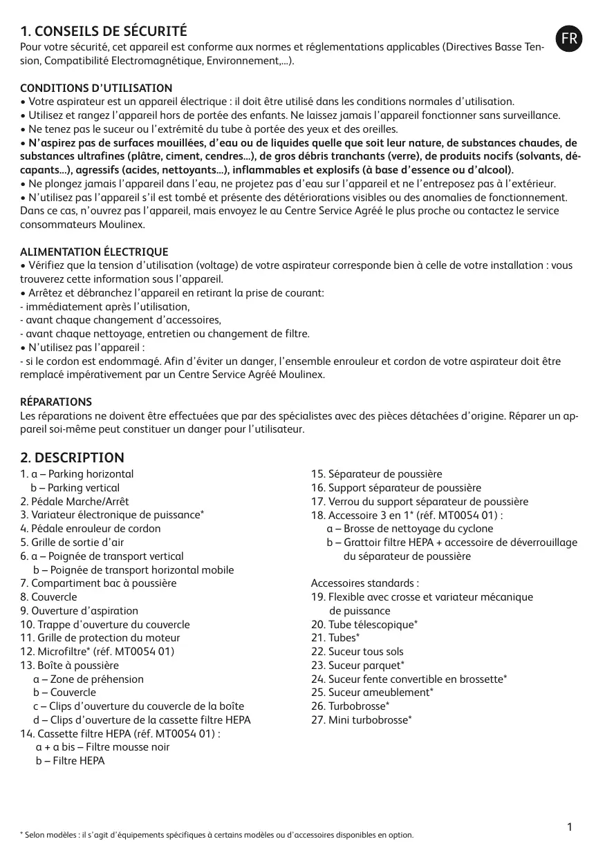 16. Support séparateur de poussière 17. Verrou du support séparateur de poussière 18. Accessoire 3 en 1* (réf. MT0054 01) : a – Brosse de nettoyage du cyclone b – Grattoir filtre HEPA + accessoire de déverrouillage du séparateur de poussière Accessoires standards : 19. Flexible avec crosse et variateur mécanique de puissance 20. Tube télescopique* 21. Tubes* 22. Suceur tous sols 23. Suceur parquet* 24. Suceur fente convertible en brossette* 25. Suceur ameublement* 26. Turbobrosse* 27. Mini turbobrosse*