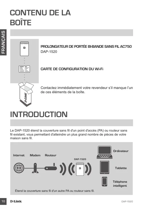 Contactez immédiatement votre revendeur s’il manque l’un de ces éléments de la boîte. INTRODUCTION Le DAP-1520 étend la couverture sans fil d'un point d'accès (PA) ou routeur sans fil existant, vous permettant d'atteindre un plus grand nombre de pièces de votre maison sans fil. Ordinateur Internet Modem Routeur DAP-1520 Tablette Téléphone intelligent Étend la couverture sans fil d'un autre PA ou routeur sans fil.