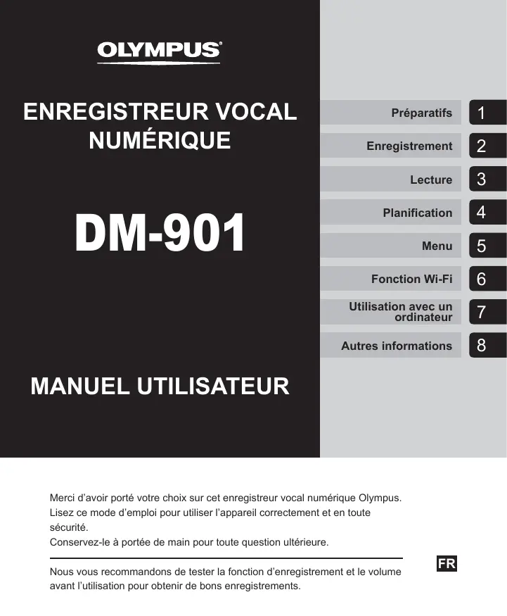 MANUEL UTILISATEUR Merci d’avoir porté votre choix sur cet enregistreur vocal numérique Olympus. Lisez ce mode d’emploi pour utiliser l’appareil correctement et en toute sécurité. Conservez-le à portée de main pour toute question ultérieure. Nous vous recommandons de tester la fonction d’enregistrement et le volume avant l’utilisation pour obtenir de bons enregistrements.