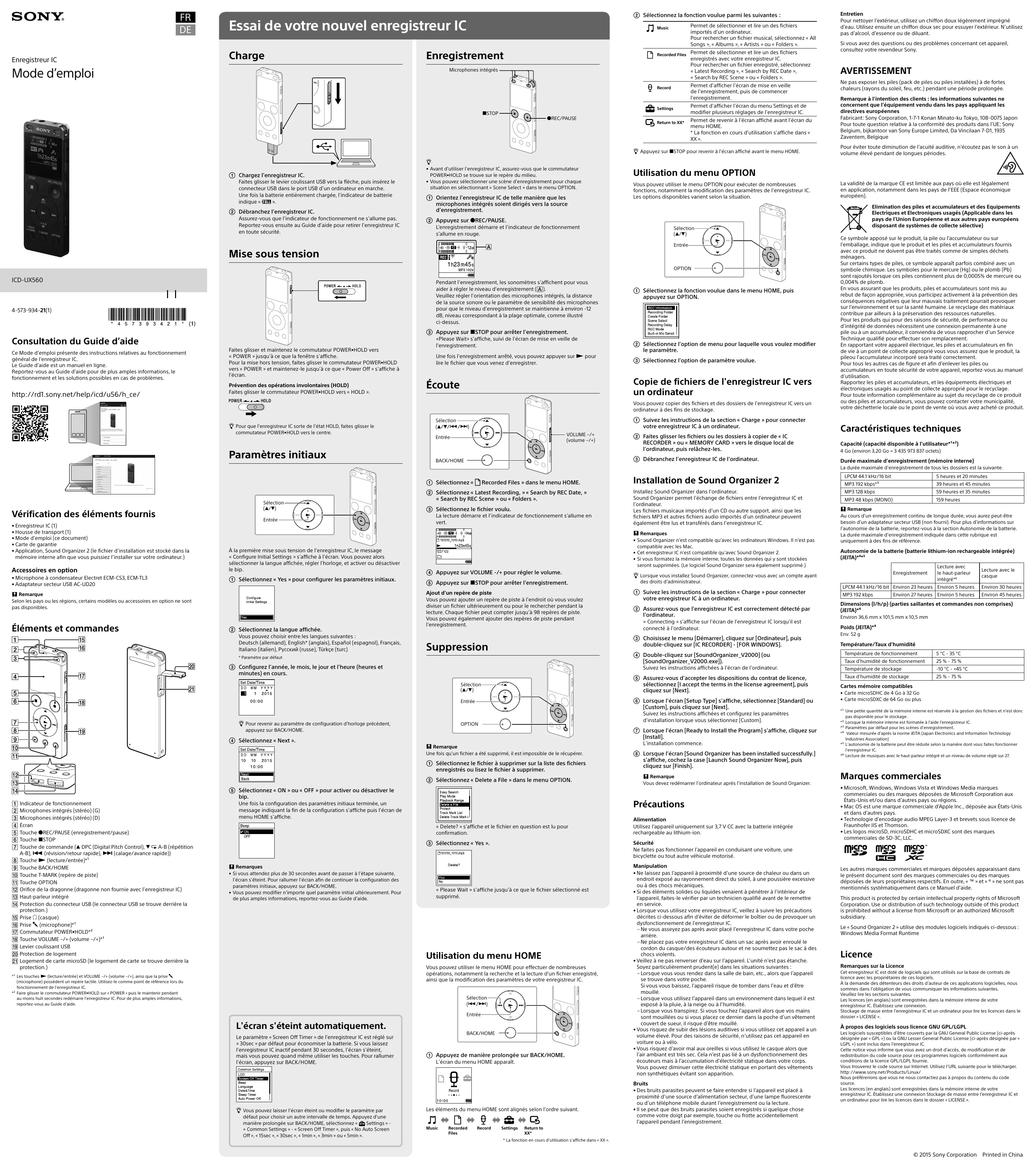 votre enregistreur IC à un ordinateur. VOLUME –/+ (volume –/+) Entrée Faites glisser les fichiers ou les dossiers à copier de « IC RECORDER » ou « MEMORY CARD » vers le disque local de l'ordinateur, puis relâchez-les. Débranchez l'enregistreur IC de l'ordinateur. BACK/HOME Ce symbole apposé sur le produit, la pile ou l’accumulateur ou sur l’emballage, indique que le produit et les piles et accumulateurs fournis avec ce produit ne doivent pas être traités comme de simples déchets ménagers. Sur certains types de piles, ce symbole apparaît parfois combiné avec un symbole chimique. Les symboles pour le mercure (Hg) ou le plomb (Pb) sont rajoutés lorsque ces piles contiennent plus de 0,0005% de mercure ou 0,004% de plomb. En vous assurant que les produits, piles et accumulateurs sont mis au rebut de façon appropriée, vous participez activement à la prévention des conséquences négatives que leur mauvais traitement pourrait provoquer sur l’environnement et sur la santé humaine. Le recyclage des matériaux contribue par ailleurs à la préservation des ressources naturelles. Pour les produits qui pour des raisons de sécurité, de performance ou d’intégrité de données nécessitent une connexion permanente à une pile ou à un accumulateur, il conviendra de vous rapprocher d’un Service Technique qualifié pour effectuer son remplacement. En rapportant votre appareil électrique, les piles et accumulateurs en fin de vie à un point de collecte approprié vous vous assurez que le produit, la pileou l'accumulateur incorporé sera traité correctement. Pour tous les autres cas de figure et afin d’enlever les piles ou accumulateurs en toute sécurité de votre appareil, reportez-vous au manuel d’utilisation. Rapportez les piles et accumulateurs, et les équipements électriques et électroniques usagés au point de collecte approprié pour le recyclage. Pour toute information complémentaire au sujet du recyclage de ce produit ou des piles et accumulateurs, vous pouvez contacter votre municipalité, votre déchetterie locale ou le point de vente où vous avez acheté ce produit. Caractéristiques techniques Capacité (capacité disponible à l'utilisateur*¹*²) 4 Go (environ 3,20 Go = 3 435 973 837 octets) Durée maximale d'enregistrement (mémoire interne) La durée maximale d'enregistrement de tous les dossiers est la suivante. Sélectionnez « Recorded Files » dans le menu HOME. Sélectionnez « Latest Recording, » « Search by REC Date, » Sélection